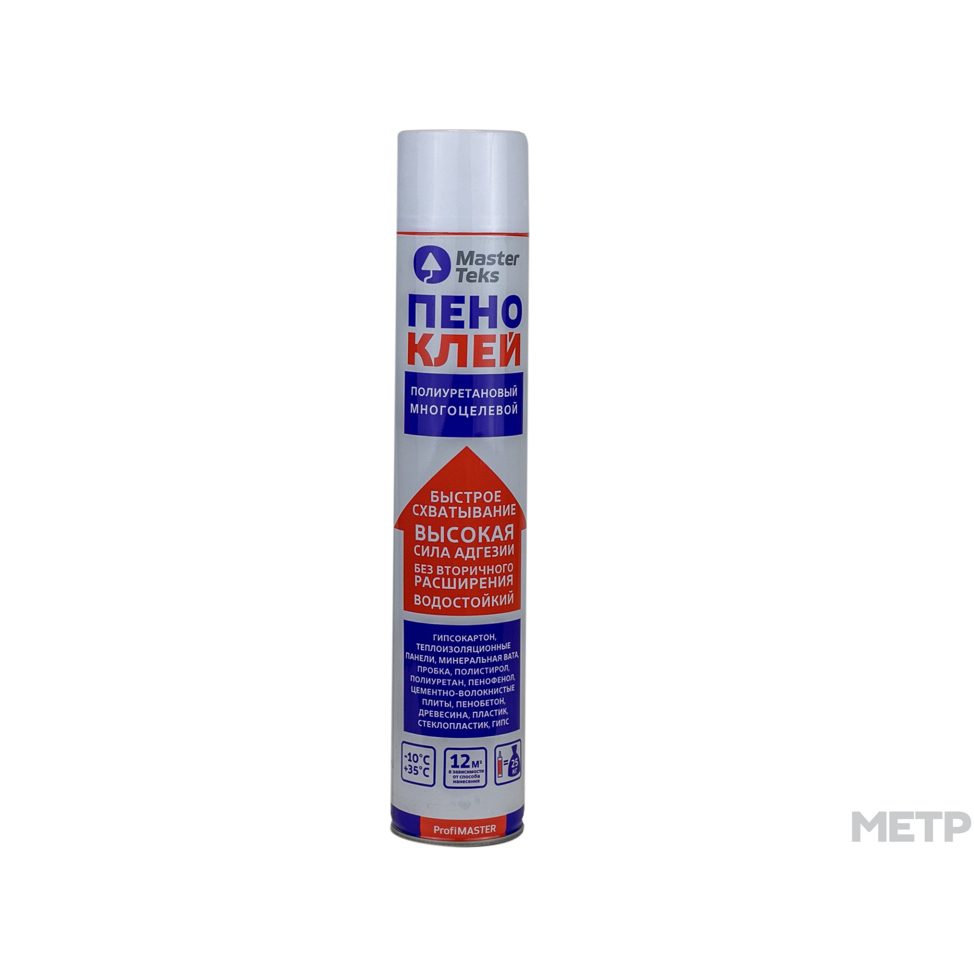 Пено-клей полиуретановый ProfiMaster 750 мл, бытовой многоцелевой - однокомпонентный быстросохнущий полиуретановый клей в аэрозольном баллоне для наружных и внутренних работ. Полимеризуется за счет влаги воздуха. Подходит для всех видов строительных и отделочных материалов. Прост и удобен в применении. Для внутренних и наружных работ. Без вторичного расширения. Быстро схватывает (корректировка 10-15 минут) и быстро сохнет. Высокая адгезия к существующим строительным материалам и поверхностям. Экономичный расход – 1 баллон равен 25 кг сухой клеевой смеси. Водостойкий, атмосферостойкий, не стекает с вертикальных поверхностей.