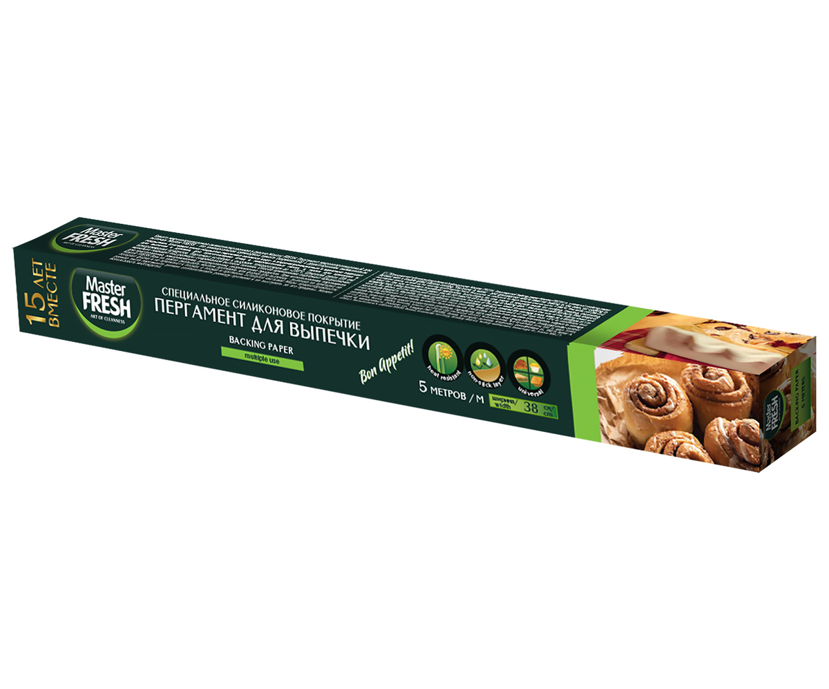 Пергамент для выпечки Master FRESH европейского производства с двухсторонним силиконизированным покрытием, благодаря этому покрытию пергамент является водо- и жиронепроницаемым и идеально подходит для выпечки в духовке, для приготовления блюд в микроволновых печах, а также для хранения и замораживания продуктов. Выпечка не пригорает и равномерно пропекается даже при высоких температурах (до 230°C), что избавляет от чистки рабочих поверхностей. Пергамент помогает приготовить качественную выпечку и сохранить настоящий вкус продуктов! Рулон шириной 38 см – оптимальная ширина для современной духовки! Дополнительные советы: удобно готовить дома роллы, удобно заворачивать в пергамент продукты для хранения в холодильнике, удобно использовать в хлебницах. Пергамент Master FRESH упакован в индивидуальную картонную многоразовую коробочку, что очень удобно при хранении, так как пергамент не разматывается при использовании в ящике.