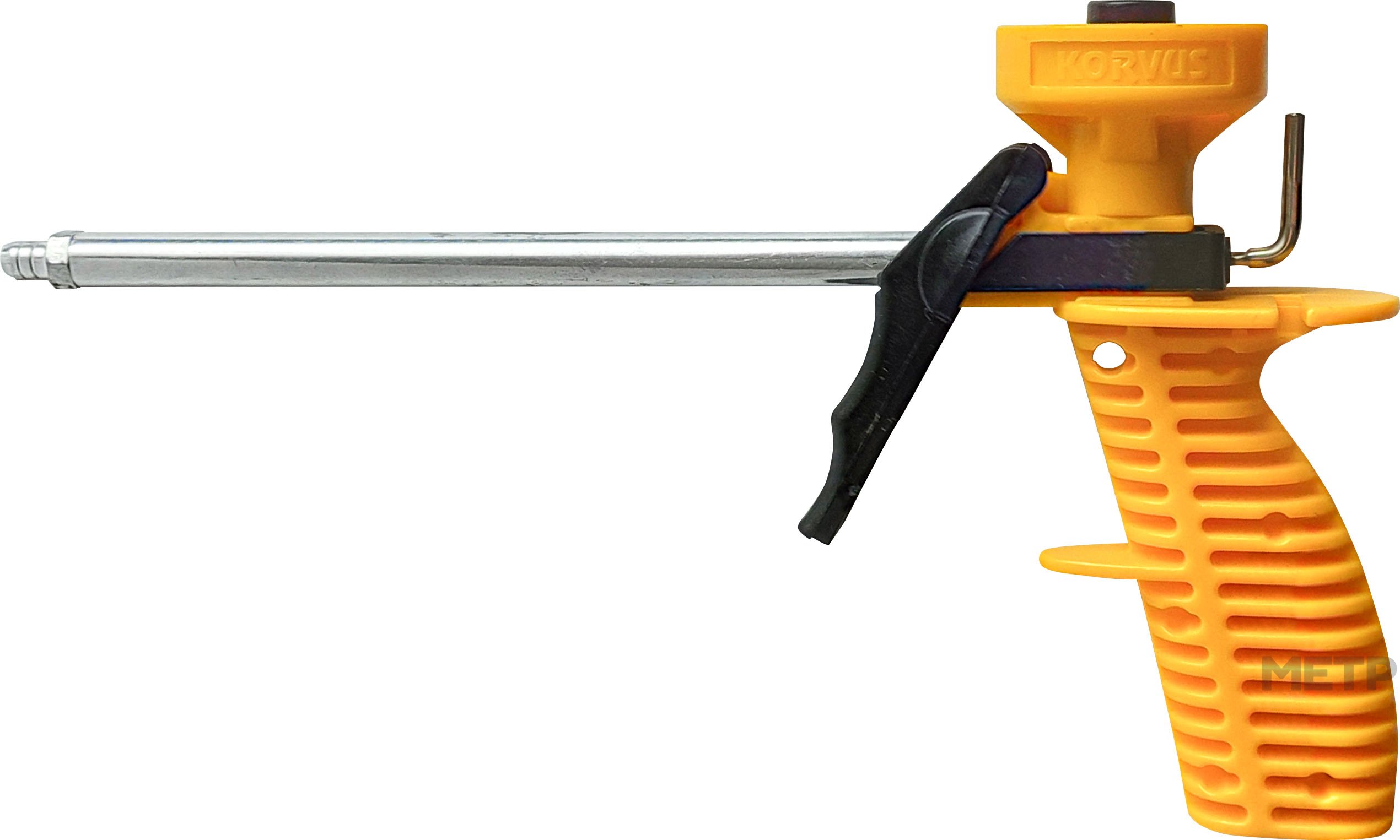 Пистолет для монтажной пены Korvus изготовлен из металла, алюминиевого сплава и стали. Удлиненное дуло позволяет заполнять пустоты в труднодоступных местах. Пистолет имеет игольчатый металлический клапан и адаптер с тефлоновым покрытием. Весит пистолет мало, поэтому во время работы не появится усталость и напряжение. Пистолет устойчив к ударам и падениям, за счет этого увеличивается срок службы. Пистолет с двумя клапанами. Один наконечник предназначен для выхода пены из емкости, а другой для выхода из наконечника. Чтобы пена начала выходить, необходимо нажать на курок.