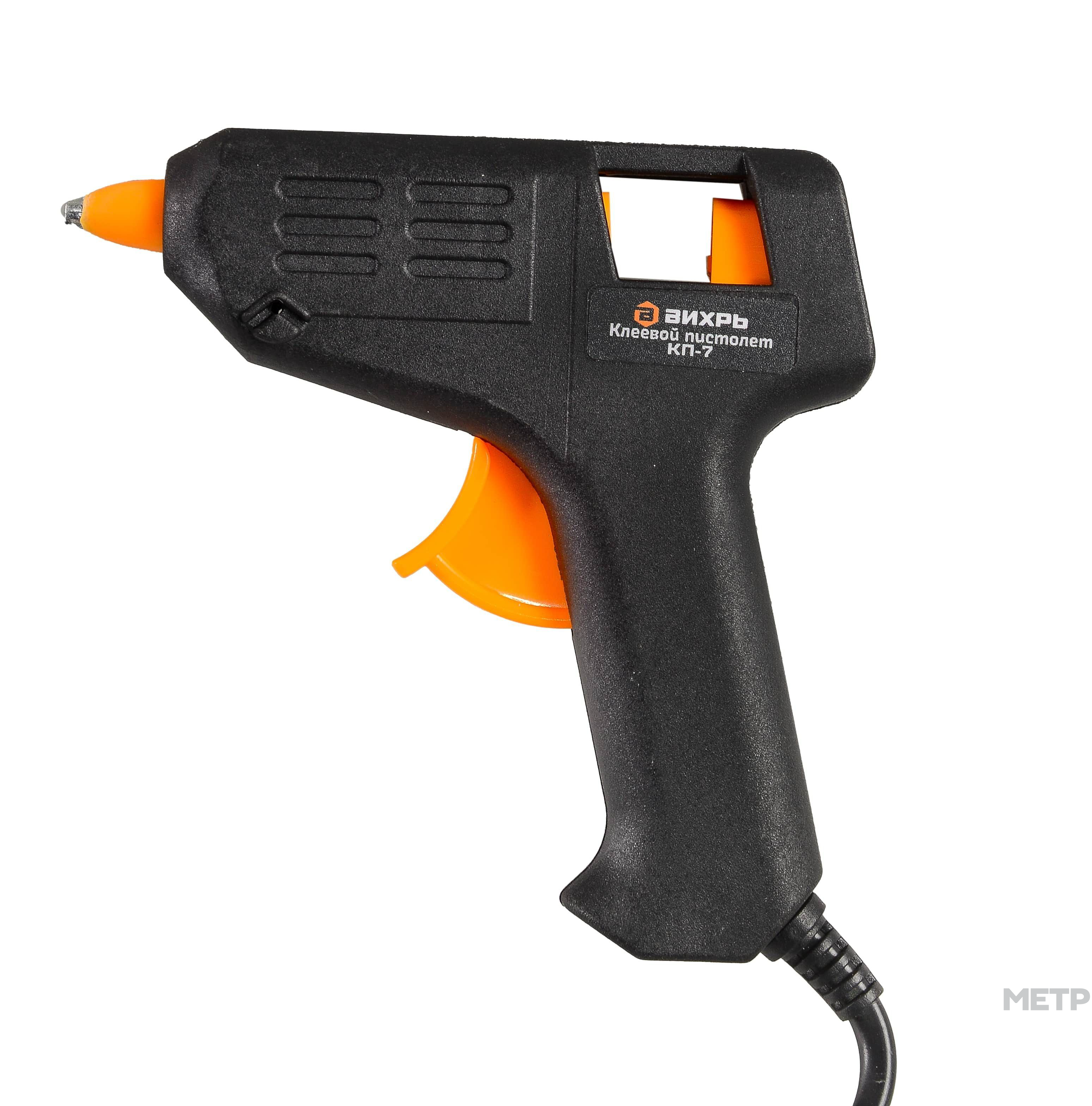 Пистолет клеевой КП-7 20Вт 7мм Вихрь обеспечит быстрое склеивание бумаги, металла, дерева, пластика, кожи, керамики, стекла. работает от сети, что обеспечивает быстрый нагрев стержня и возможность уже через 3-4 мин приступить к процессу склейки. Поверхности должны быть чистыми и сухими, допускается комбинирование разных материалов для прочного клеевого соединения. Подача горячего клея осуществляется путем нажатия на клавишу в центре корпуса. Устройство имеет защиту от капель, что дает возможность избежать случайной утечки клеевого состава, загрязнения рабочего места. В передней части корпуса расположена металлическая подставка, на которую можно установить устройство в паузах между процессами склейки.