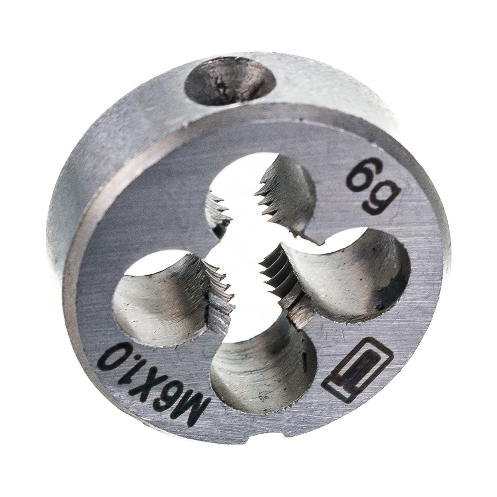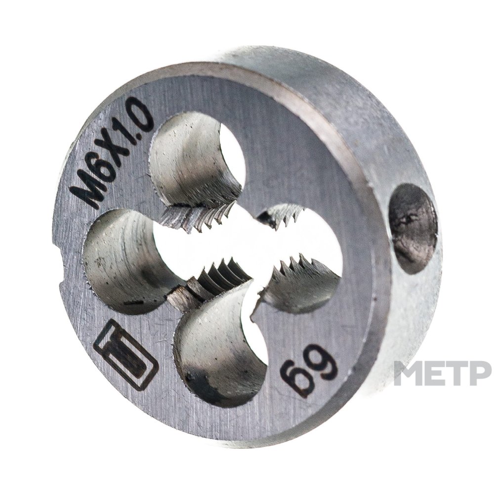 Плашка М6 1 мм Сибртех. Надежный, проверенный временем инструмент, предназначенный для самостоятельной подготовки труб к установке путем нарезания резьбы снаружи. Конструкция включает цельный корпус с резьбовыми отверстиями и соответствующими канавками. Модель отличается простотой эксплуатации.