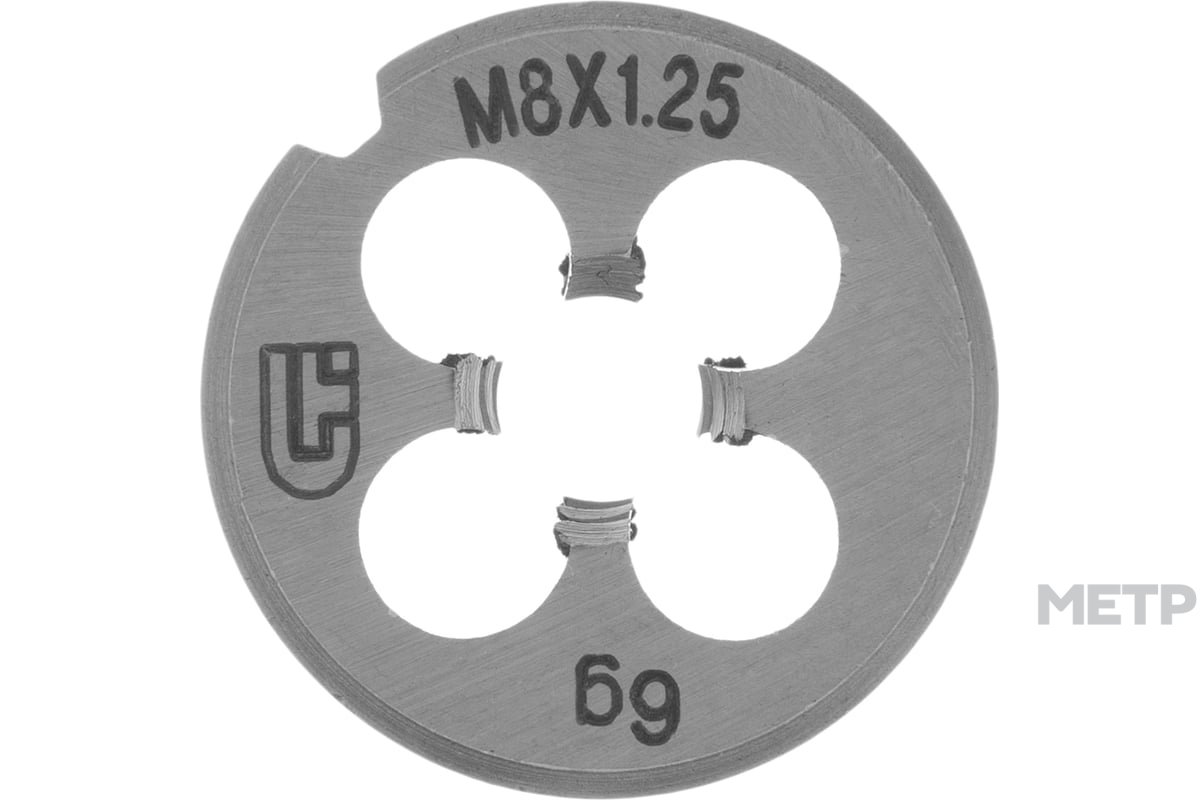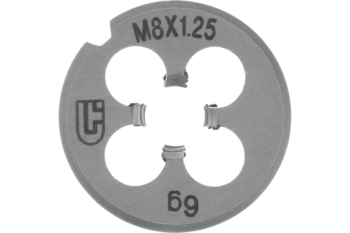 Плашка М8 1,25 мм Сибртех. Инструмент предназначен для самостоятельной нарезки резьбы на трубах (отопительных/водопроводных) с целью их подготовки к монтажу в рамках реорганизации соответствующих коммуникаций частных домов. Резьбовое отверстие с канавками расположено в цельном, неразборном корпусе.