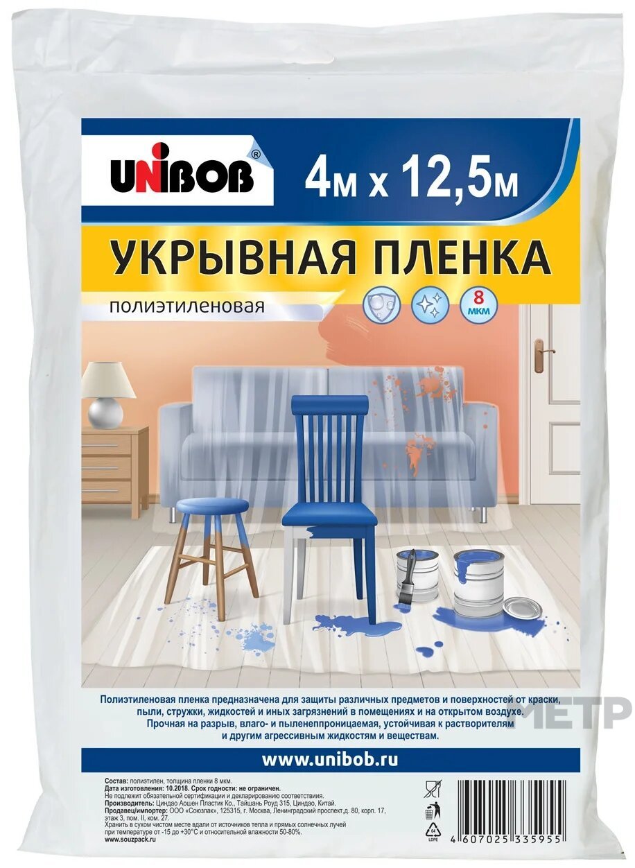 Пленка защитная 4*12,5 м 8 мкм UNIBOB имеет высокую устойчивость к различным воздействиям окружающей среды. Не боится пыли, грязи, вредных химических растворов. Находит широкое применение в строительной сфере и в общепите. Снимается с укрываемой поверхности одним движением руки. Материал полиэтилен.