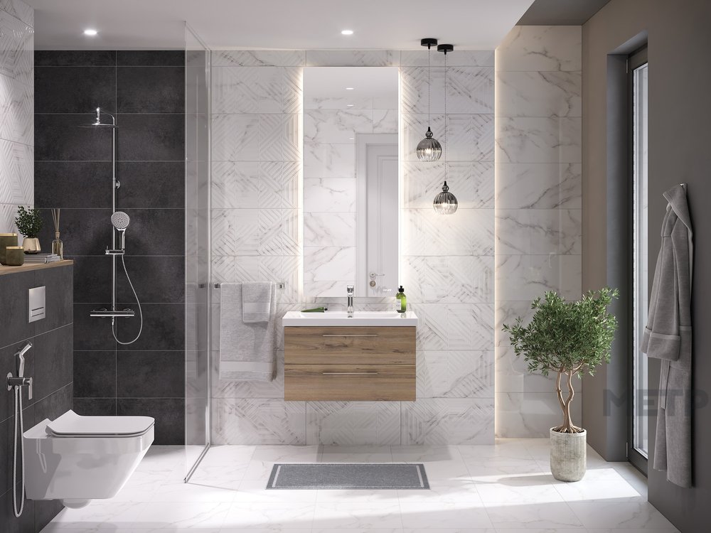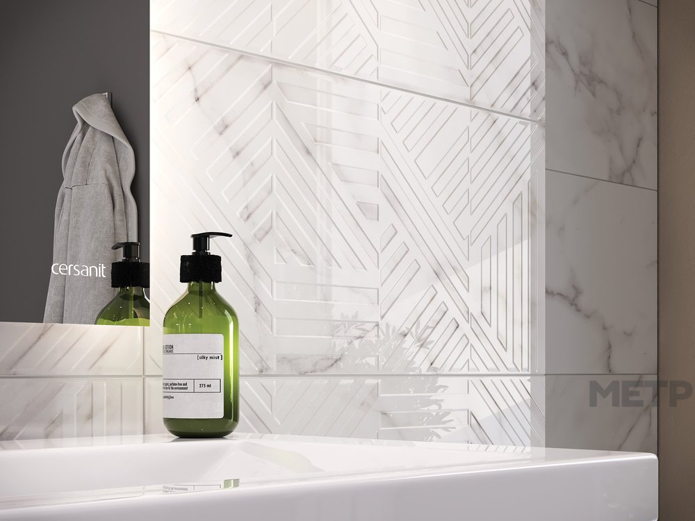 Плитка настенная керамическая коллекции Moonlight, белая рельефная от фабрики Cersanit размером 298х598 мм, арт.17573. Любители монохромной классики оценят коллекцию Moonlight, основу которой составляет плитка под мрамор Calacata Gold. Тёплый оттенок создаёт уют, а глянцевая поверхность материала визуально расширяет пространство. Интересная игра бликов света возникает на рельефной плитке. Объёмный узор в сочетании с тёплым мрамором дарит нежность интерьеру, смотрится стильно и нетривиально. Тёмно-серый бетон с матовой поверхностью поначалу вносит хаос — брутальная текстура резко контрастирует с мягким и нежным мрамором Calacata Gold. Но гармонию создаёт керамогранит под мрамор Moonlight формата 42х42, который дополняет светлую плитку.