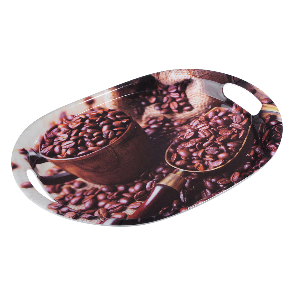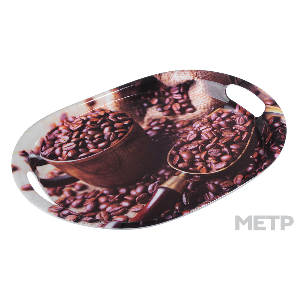Поднос столовый 33х24.5х1.8см Кофейные зерна подойдет для любителей разноцветных рисунков. Разнообразная цветовая гамма на подносах демонстрирует вкусные кексики, горячий кофе, свежие овощи и фрукты. Яркие столовые приборы способствуют повышению аппетита, заряжают порцией энергии и мгновенно поднимают настроение.