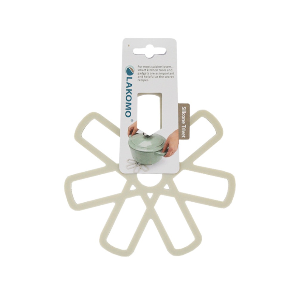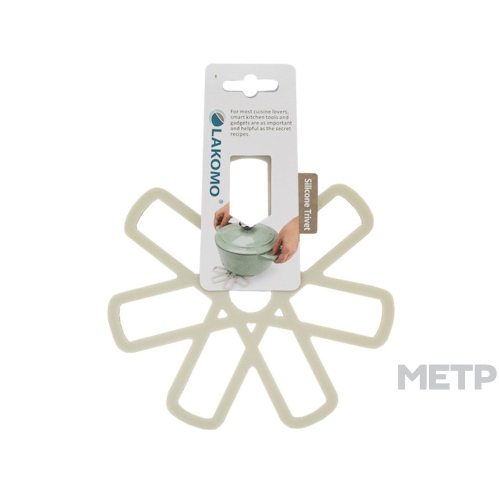 Подставка под горячее LAKOMO серый силикон имеет уникальное изображение цветочка с серебристыми лепестками. Края лепестков слегка выпуклые. На подставке можно разместить горячую тарелку с супом, чашку бодрящего кофе или небольшую кастрюлю. С легкостью выдерживает высокую температуру блюда.