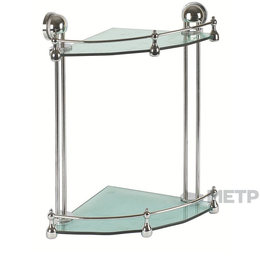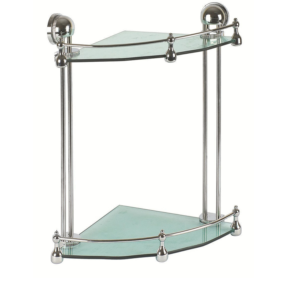 Полка стеклянная, угловая, 2-х ярусная. Высокая устойчивость к коррозии. Монтируется к стене при помощи крепления, входящего в комплект. Толщина прутьев 0,8 см. Высота борта 3 см. Максимальная нагрузка 3 кг.
