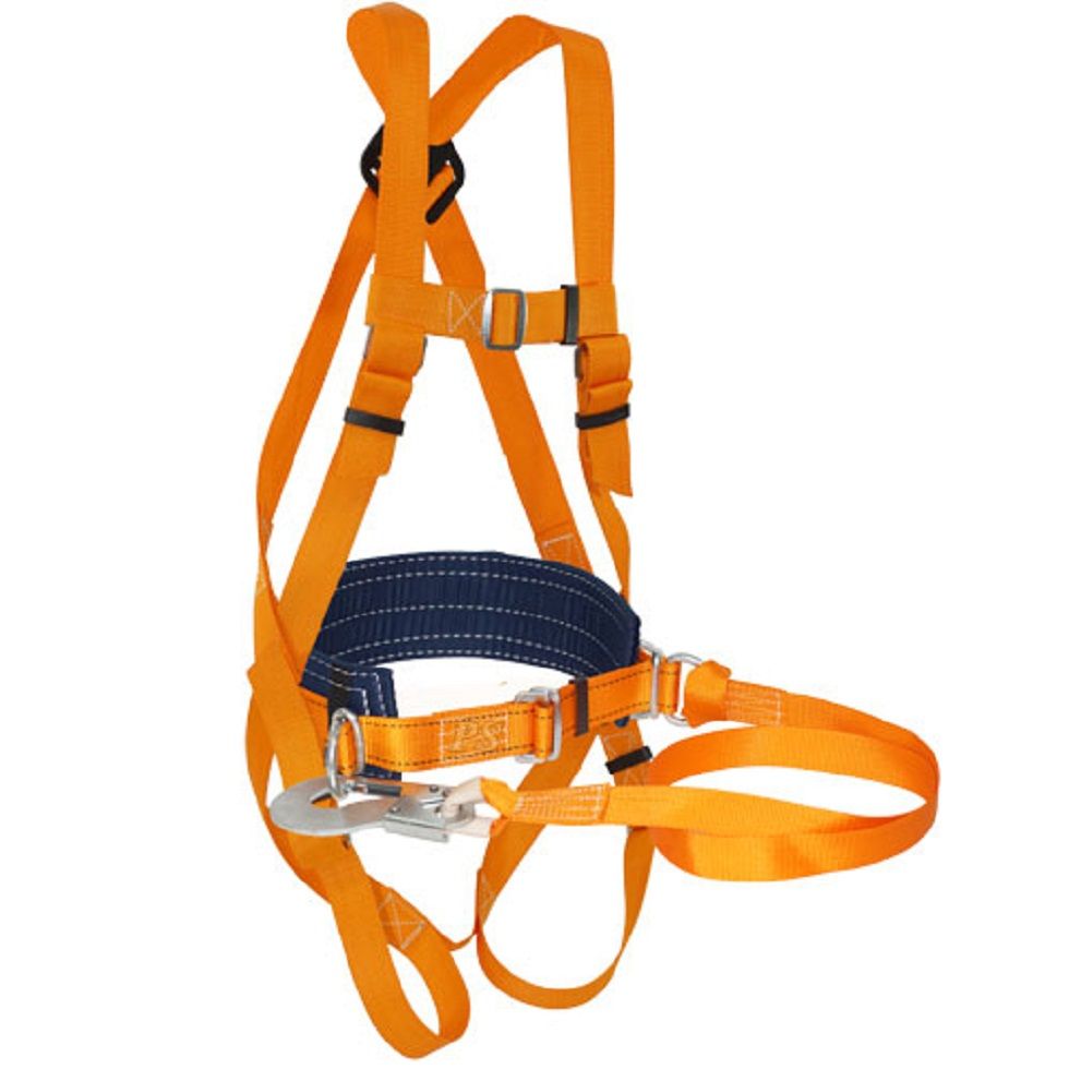 Пояс предохранительный УСП 2аАЖ лямочный L включает в себя ремень с пряжкой (позволяет подгонять пояс по фигуре человека), подкладку под ремень (кушак), наплечные и набедренными лямки, элементы крепления – два металлические D-кольца на ремне привязи и одно на спине, строп из полиамидной ленты с монтажным карабином и амортизатором (соединен неразъемным способом крепления и предназначен для снижения усилия торможения при падении). Пояс обеспечивает удержание, позиционирование и безопасность при строительных и ремонтных работах