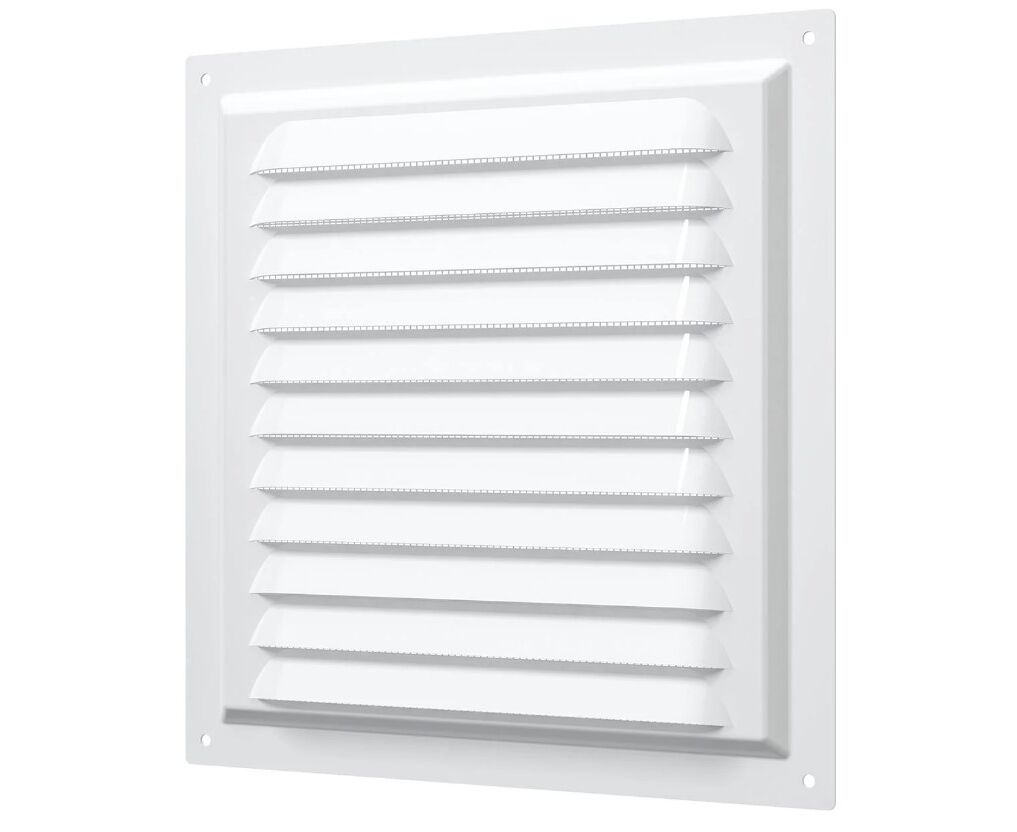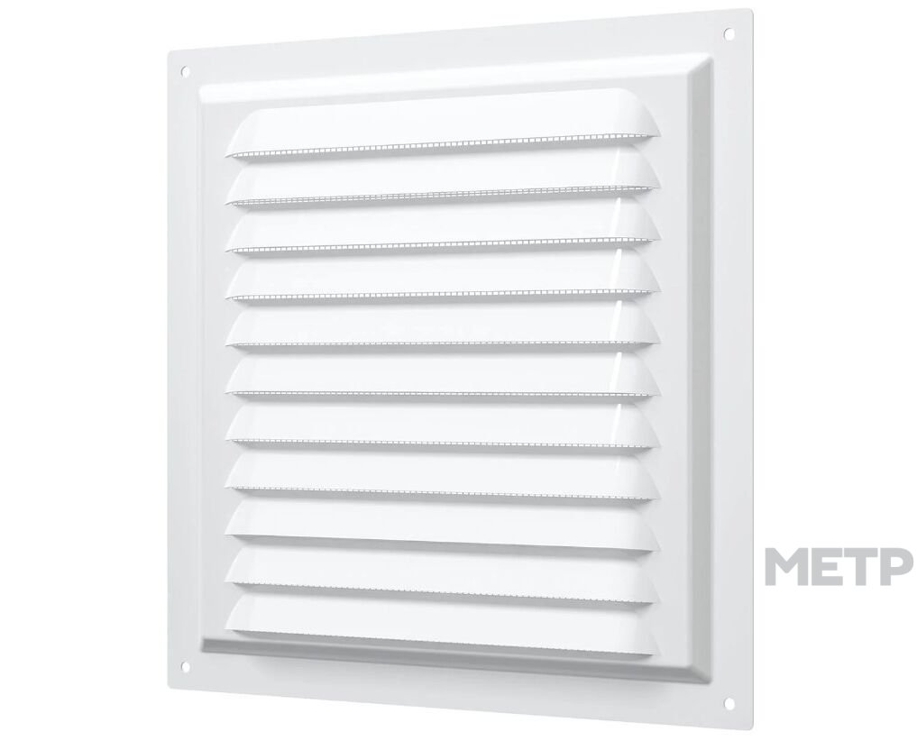 Решетка изготавливается из оцинкованной стали, которая покрывается полимерной эмалью. МЭ имеет наклонные жалюзи. Оснащена антимоскитной сеткой, которая монтируется в специальном углублении, что упрощает процесс ее замены.