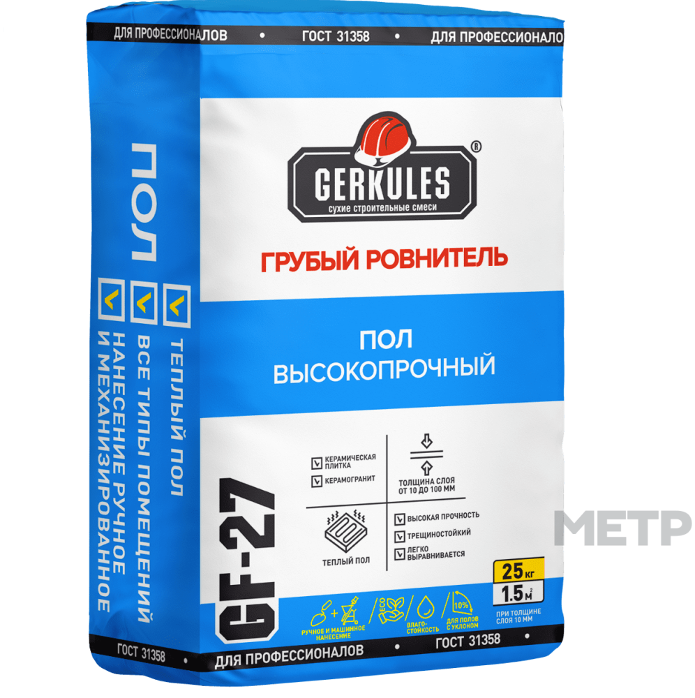 Ровнитель для пола GF-27 Геркулес 25 кг преднозначен для создания и выравнивания бесшовных полов на плитах перекрытия, цементных стяжках, бетонных и других прочных основаниях при однократном нанесении слоем 10-100 мм, а также для укладки полов с уклоном до 10% или на наклонных основаниях. Применяется для внутренних работ.