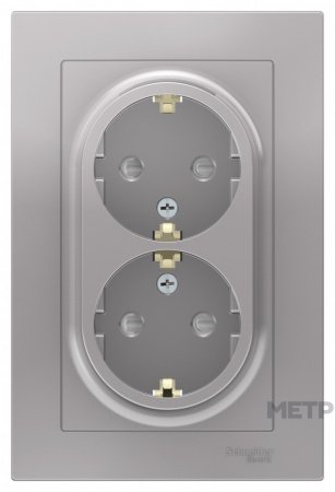 Розетка силовая двойная с заземлением и защитными шторками Atlas Design, цвет алюминий подходит для сетей 250 В, на ток 16 А. Заземляющий контакт обеспечивает дополнительную защиту от удара электрическим током. Лицевые детали из качественного ABS-пластика, устойчивого к царапинам и УФ-излучению. Усиленные прямые монтажные лапки для лучшей фиксации механизма в монтажной коробке. Контактная группа из латуни с высоким содержанием меди. Изделие поставляется в сборе в рамкой, монтируется в одноместную установочную коробку.