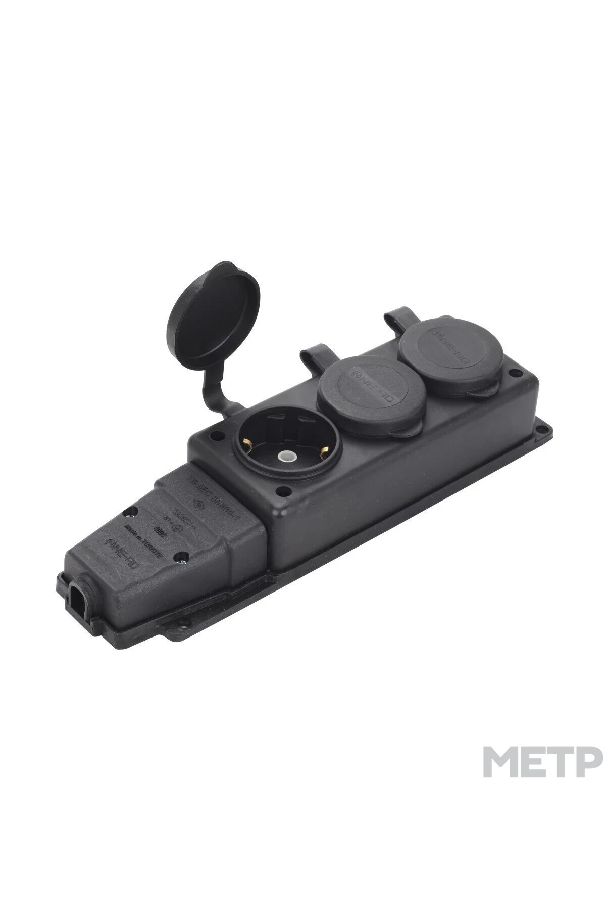 Розетка силовая накладная NE-AD тройная 16А 250В 2К+З чёрная с крышкой IP44 - тройная каучуковая розетка с защитными откидными крышками. Предназначена для подсоединения сразу трех электрических приборов в электрическую сеть напряжением 230В, номинальным током 16А. Каучуковый корпус устойчив к износу, механическому повреждению, химическому воздействию, обладает высокой эластичностью, водонепроницаемостью и отличными электроизоляционными свойствами. Отличается повышенным уровнем защиты от влаги и пыли, соответствующему IP44, а также широким диапазоном рабочих температур
