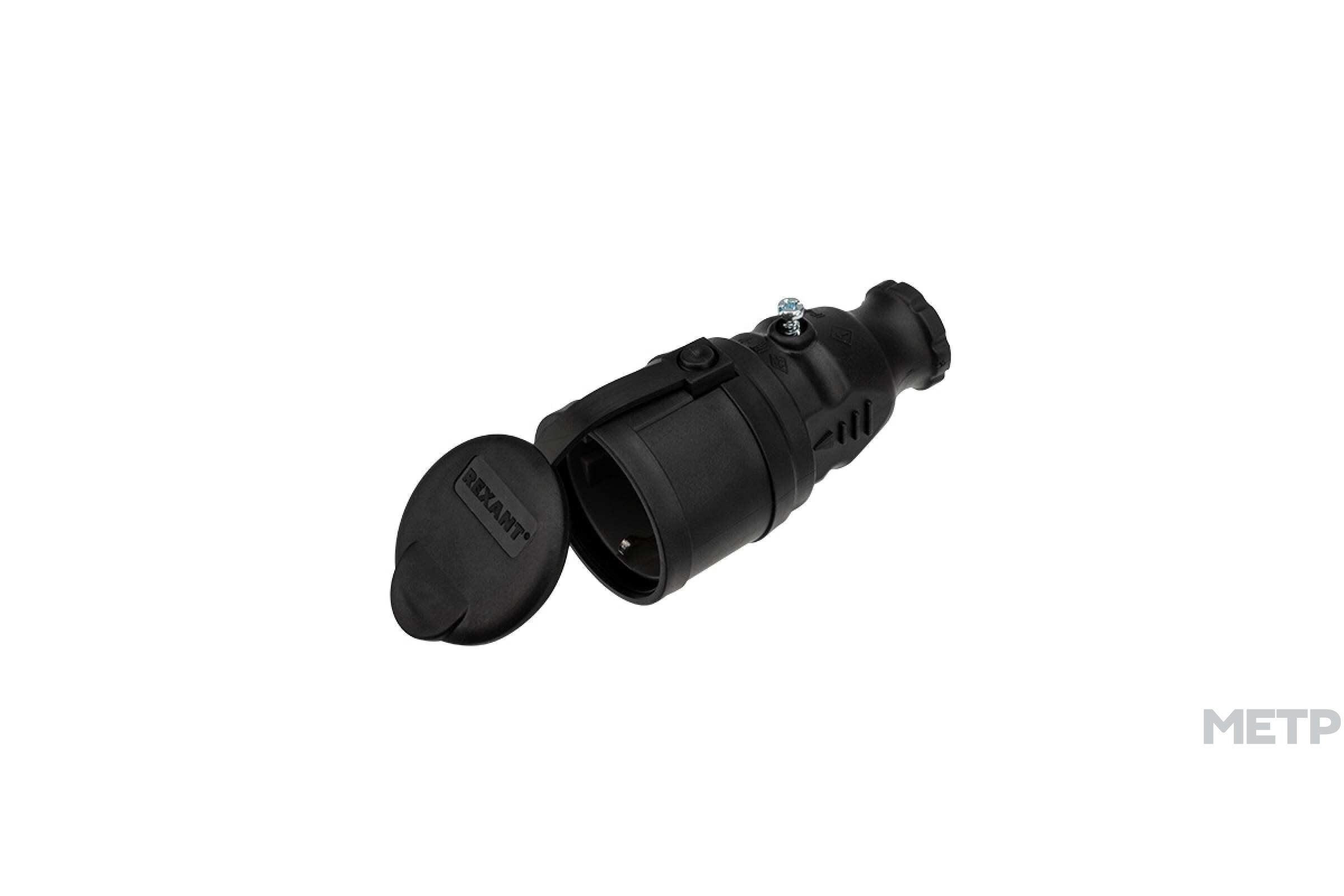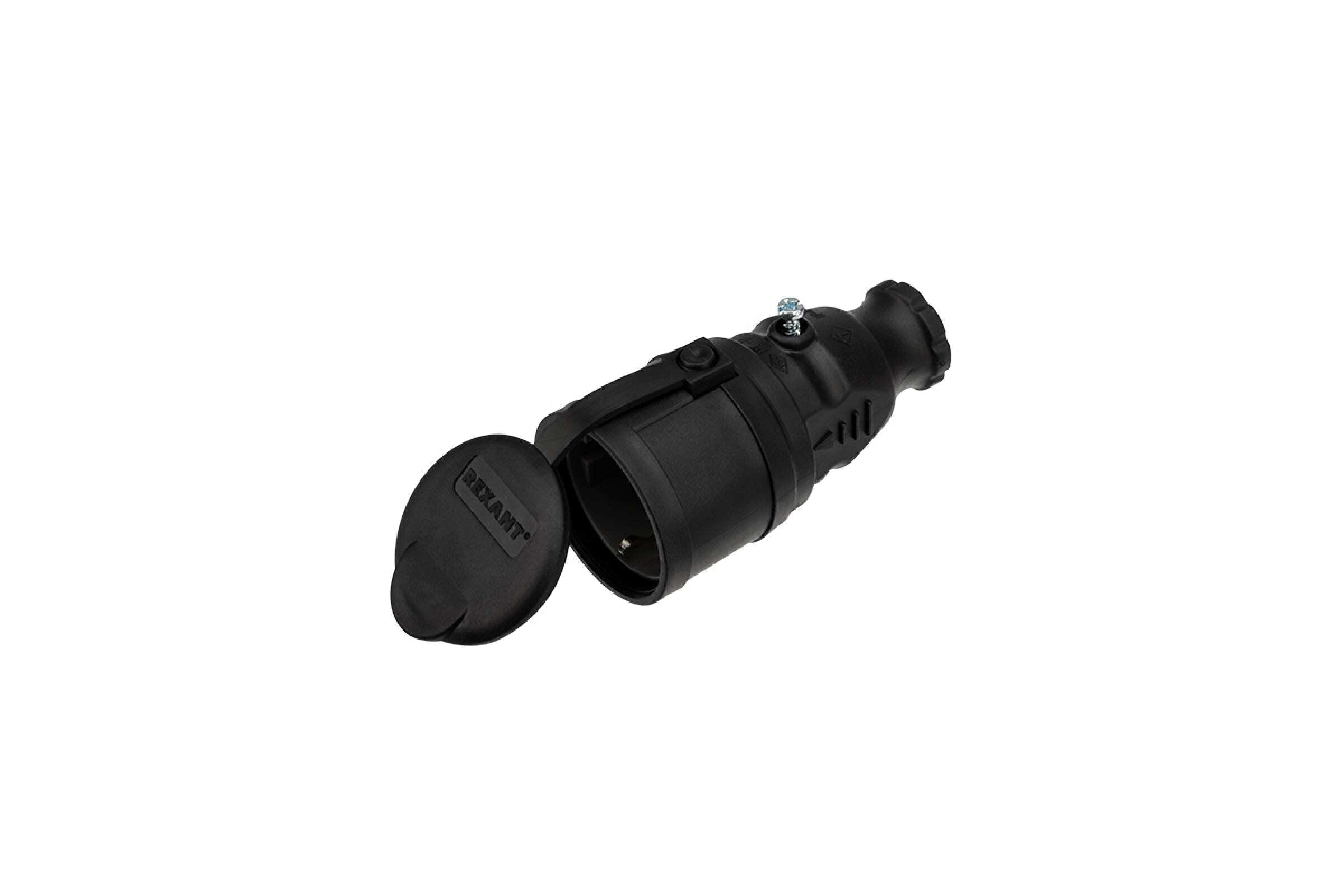 Розетка силовая переносная Rexant 16А 250В 2К+З чёрная с крышкой IP44 предназначена для использования в сложных эксплуатационных условиях с высокой влажностью и широко применяется в быту, производстве и строительстве. Она имеет степень защиты IP44 – защита от капель и брызг воды, попадающих под любым углом, и может быть применена для организации электропитания, в том числе под открытым небом, в дождь - под навесом. Не допускается эксплуатация погружением в воду. Она легко монтируется, имеет высокую надежность и долгий срок службы. Розетка оснащена защитной крышкой. Для обеспечения безопасности все детали, соприкасающиеся с токоведущими частями, выполнены из огнеупорного материала, устойчивого к температуре до +850 ⁰С. Ударопрочный разборный корпус выполнен из каучука – полимерный материал, сочетающий внешний вид, упругость и эластичность обычного каучука и эффективность обработки пластмасс.