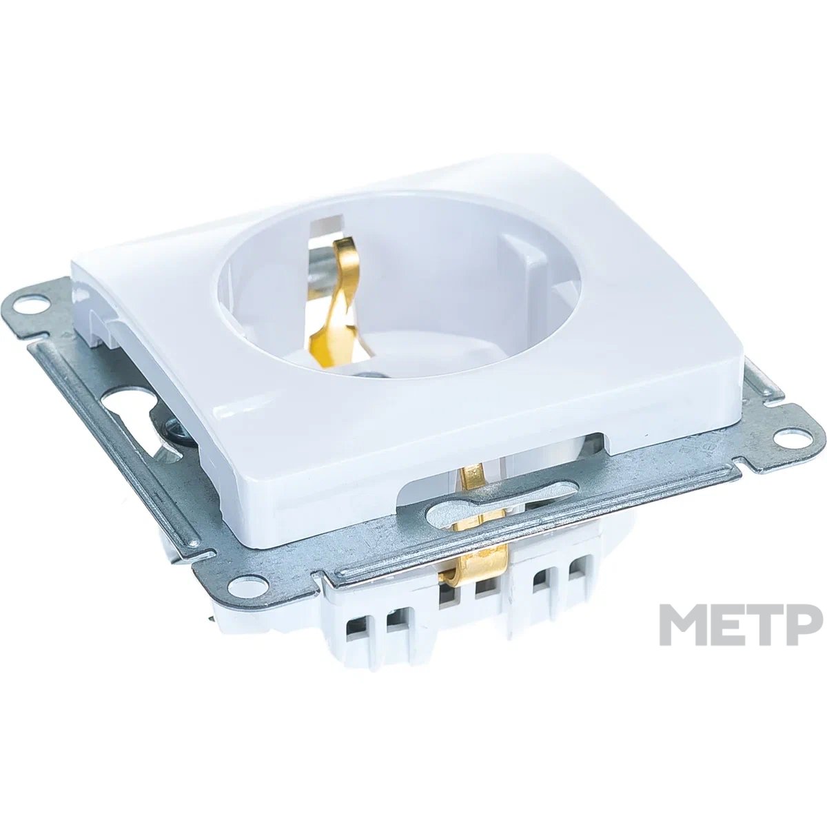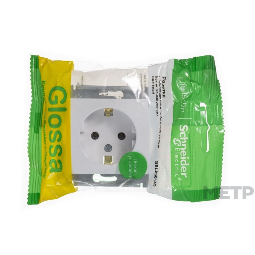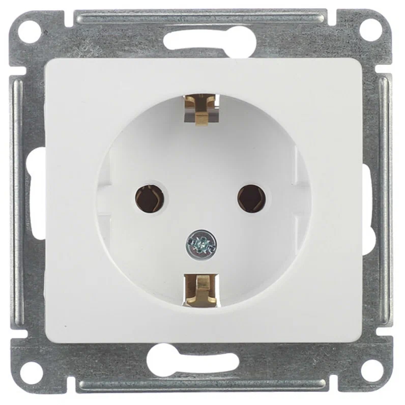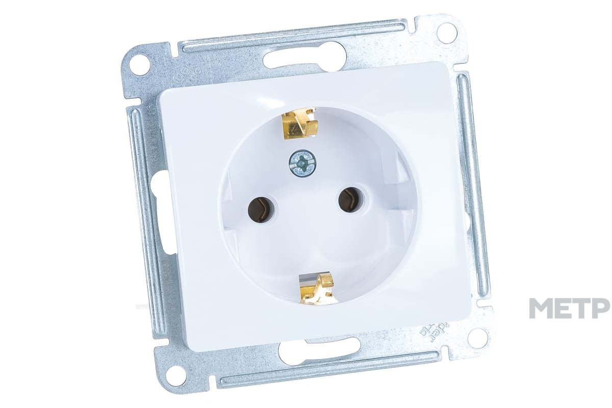 Розетка силовая встраиваемая Schneider Electric Glossa с заземлением, цвет белый подходит для сетей 250 В, на ток 16 А. Заземляющий контакт обеспечивает дополнительную защиту от удара электрическим током. При наличии заземления электрический потенциал уходит в землю, защищая человека. Розетка выполнена из материала PС+ASA, стойкого к УФ-излучению и появлению царапин. Эргономичные клеммы розеток расположены в один ряд. Прочный металлический суппорт
