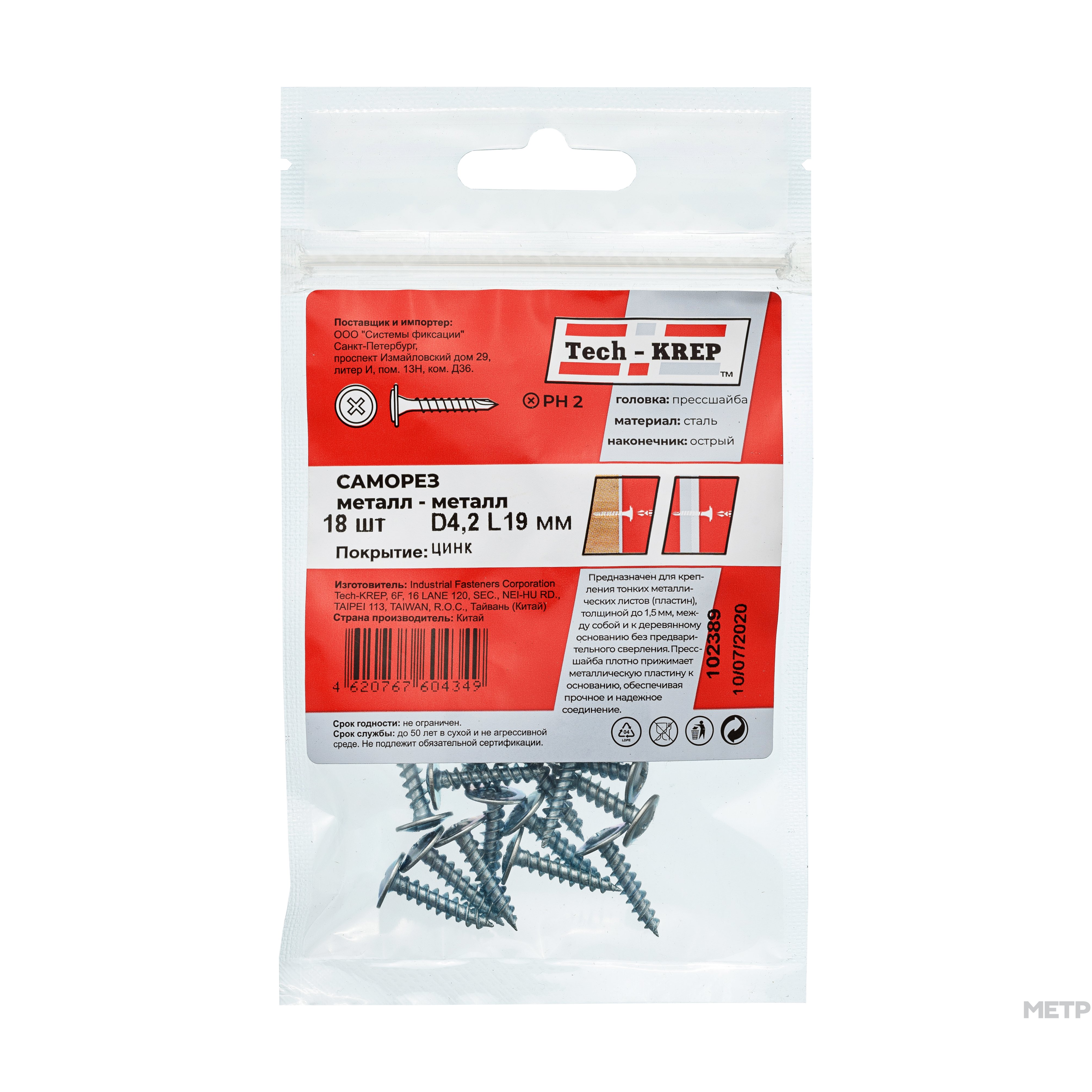 Саморез по металлу 4,2мм х19мм 18шт в упаковке частая резьба острый оцинкованный имеет полусферическую головку с прессшайбой и крестообразным шлицем PH2, полную резьбу с мелким шагом и острый наконечник. Изготовлен из углеродистой стали с антикоррозионным цинковым покрытием. Применяется для крепления металлических элементов, толщина которых не превышает 0,9 мм, между собой и к несущей поверхности без предварительного сверления.