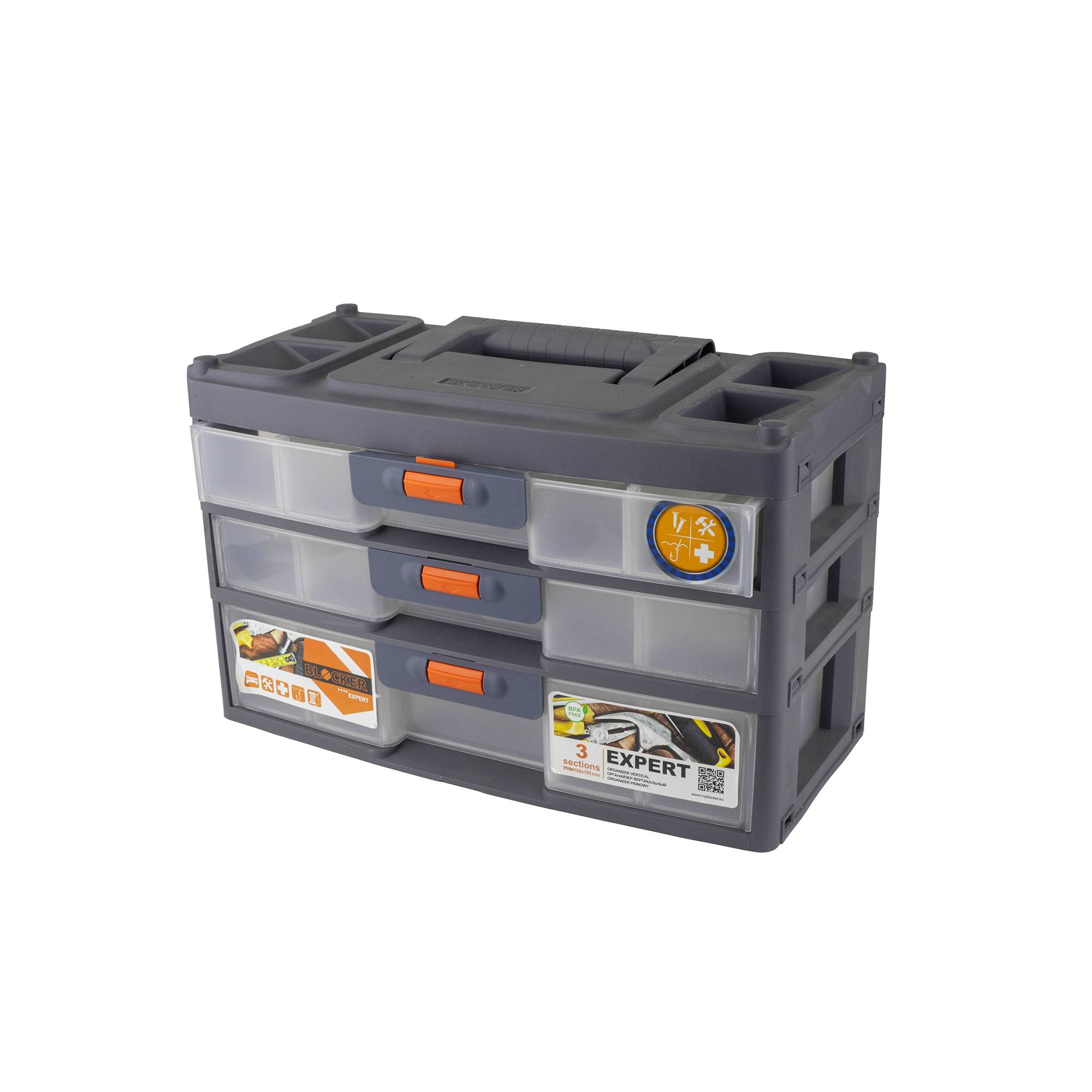 Сет д/мелочей "Expert" 3 секции 310*150*195мм Серо-свинцовый/оранжевый это удобная система хранения и перемещения мелочей. Может использоваться дома, в гараже, на даче. Помогает разместить много мелочей, сортируя их внутри отсеков. Прозрачные ящички позволяют увидеть содержимое, не открывая их. Замочки на каждом отсеке позволяют не рассыпать содержимое при перемещении.