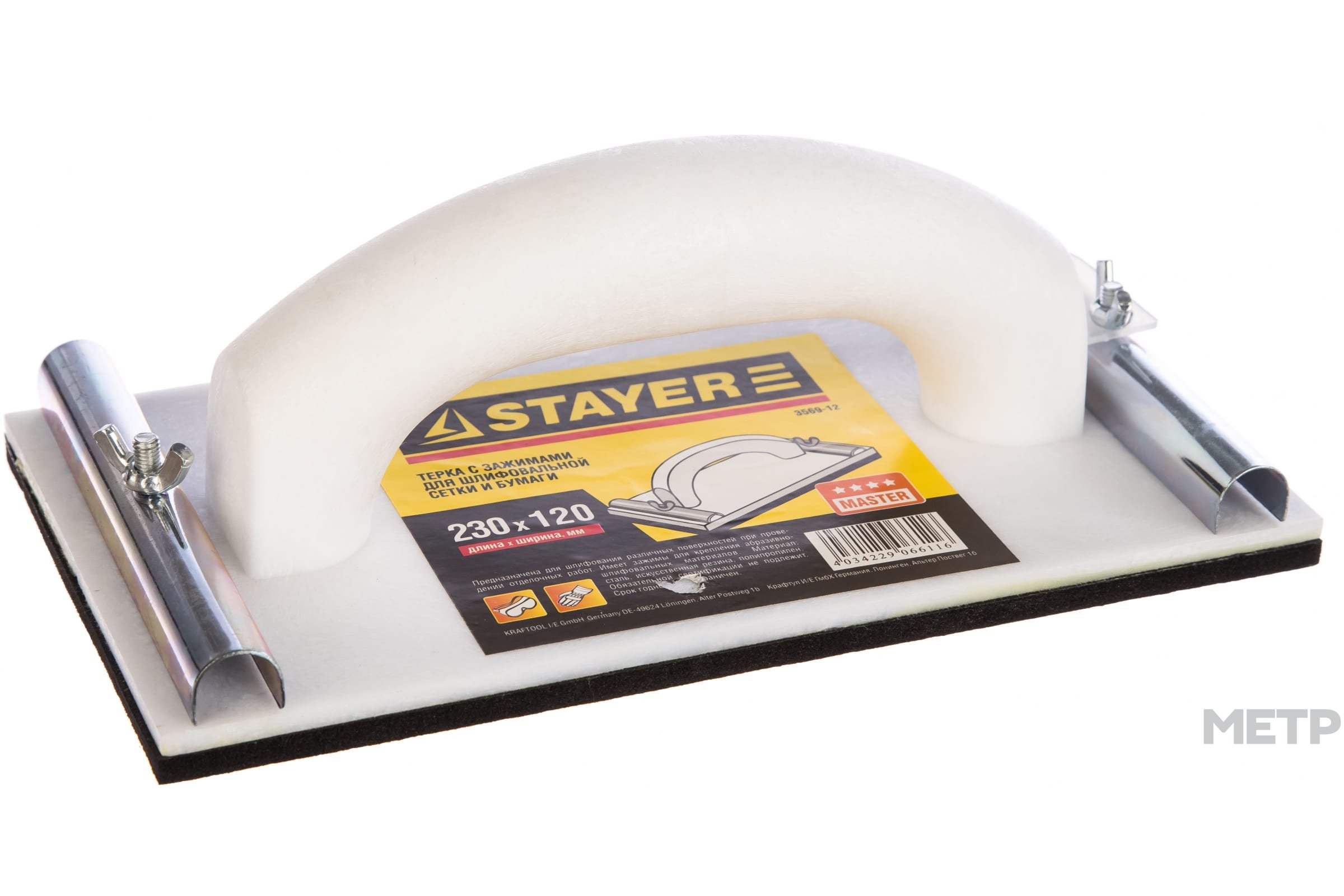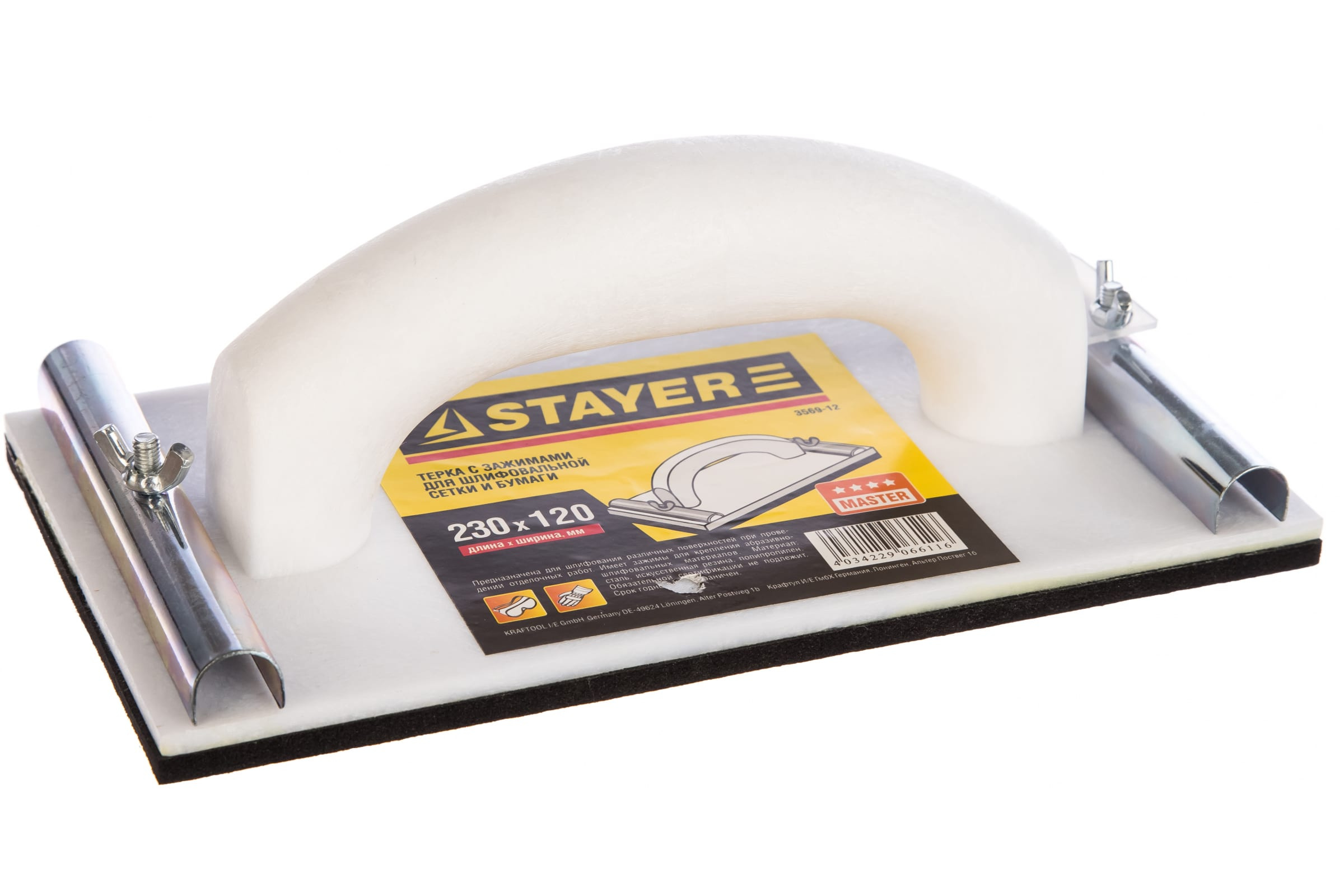 Сеткодержатель 120x230 мм STAYER — пользоваться этой шлифовальной теркой удобно: она оснащена эргономичной ручкой и рассчитана на длительный срок службы. Корпус изготовлен из устойчивого к ударам пластика с прочным резиновым покрытием. Фиксатор из металла надежно удерживает шлифовальный элемент.