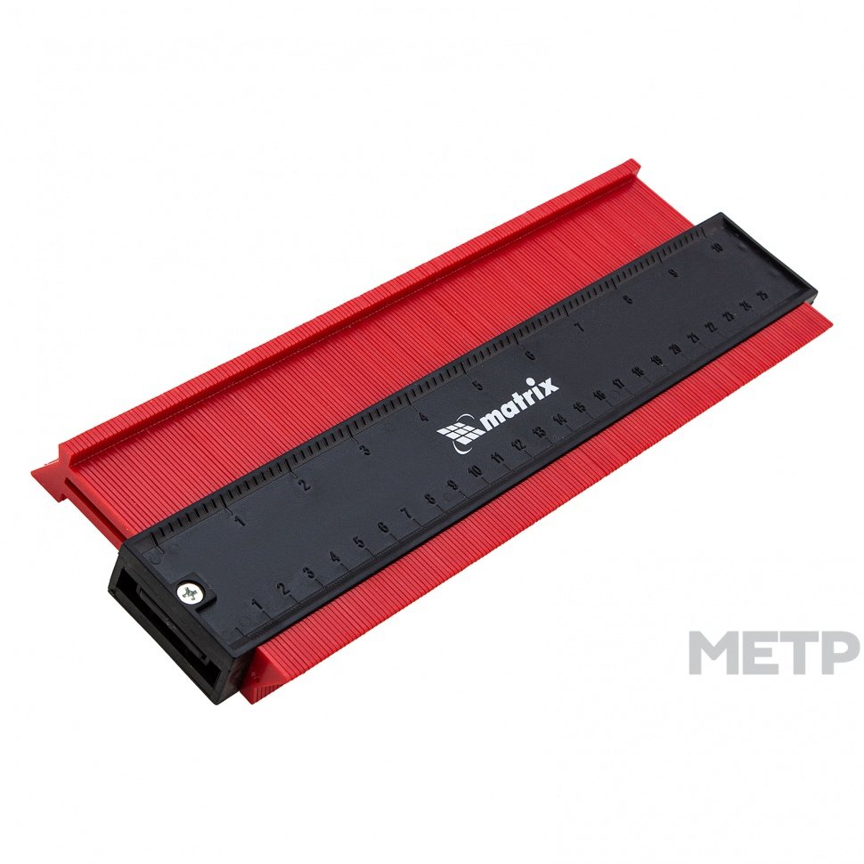 Пластиковый шаблон для копирования профиля, предназначен для копирования и переноса контуров различных форм. Шаблон необходим для точной подрезки отделочных материалов (ламинат, линолеум, кафельная плитка, гипсокартон и др.) при обходе труб водоснабжения, углов и других рельефных препятствий. Перенос контуров осуществляется при помощи выдвижных пластиковых пластин. Шаблон оснащен измерительной шкалой длиной 25 см.