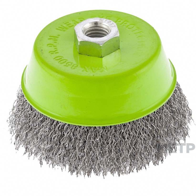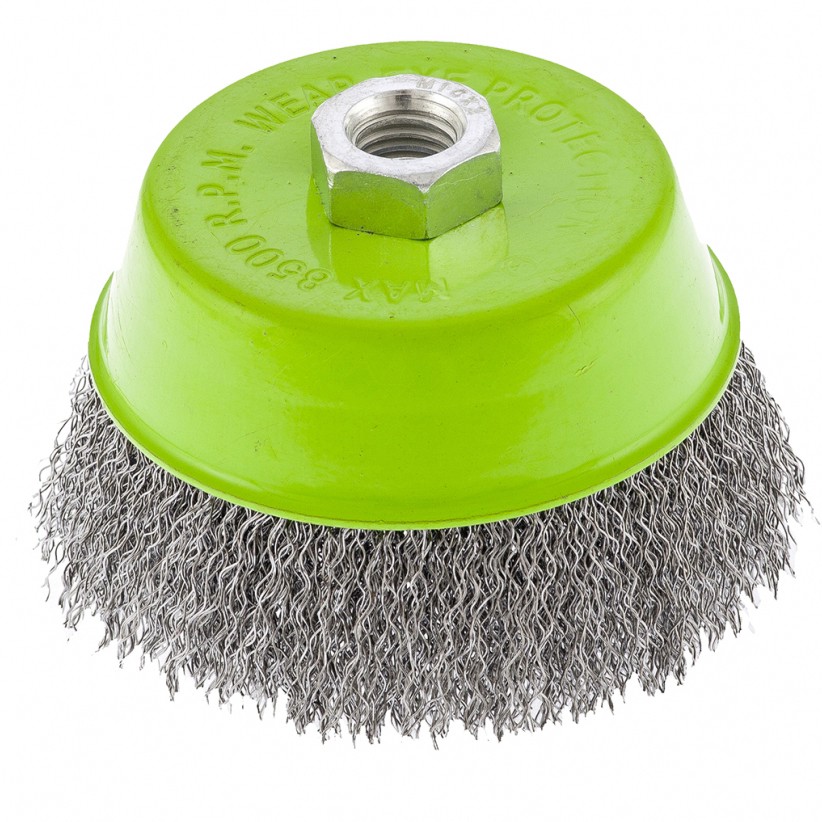 Корщетка для УШМ чашечная 100мм витая проволока сталь наиболее удобное приспособление для удаления ржавчины и старого лакокрасочного покрытия с поверхностей деревянных, металлических и пластиковых заготовок. Ворсинки проникают во все пазы и углубления, но не изменяют сложную форму изделия.