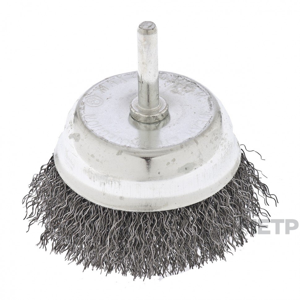 Корщетка для дрели чашечная 75мм витая проволока сталь наиболее удобное приспособление для удаления ржавчины и старого лакокрасочного покрытия с поверхностей деревянных, металлических и пластиковых заготовок. Ворсинки проникают во все пазы и углубления, но не изменяют сложную форму изделия.