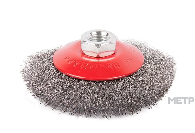 Корщетка для УШМ коническая 100мм витая проволока сталь наиболее удобное приспособление для удаления ржавчины и старого лакокрасочного покрытия с поверхностей деревянных, металлических и пластиковых заготовок. Ворсинки проникают во все пазы и углубления, но не изменяют сложную форму изделия.