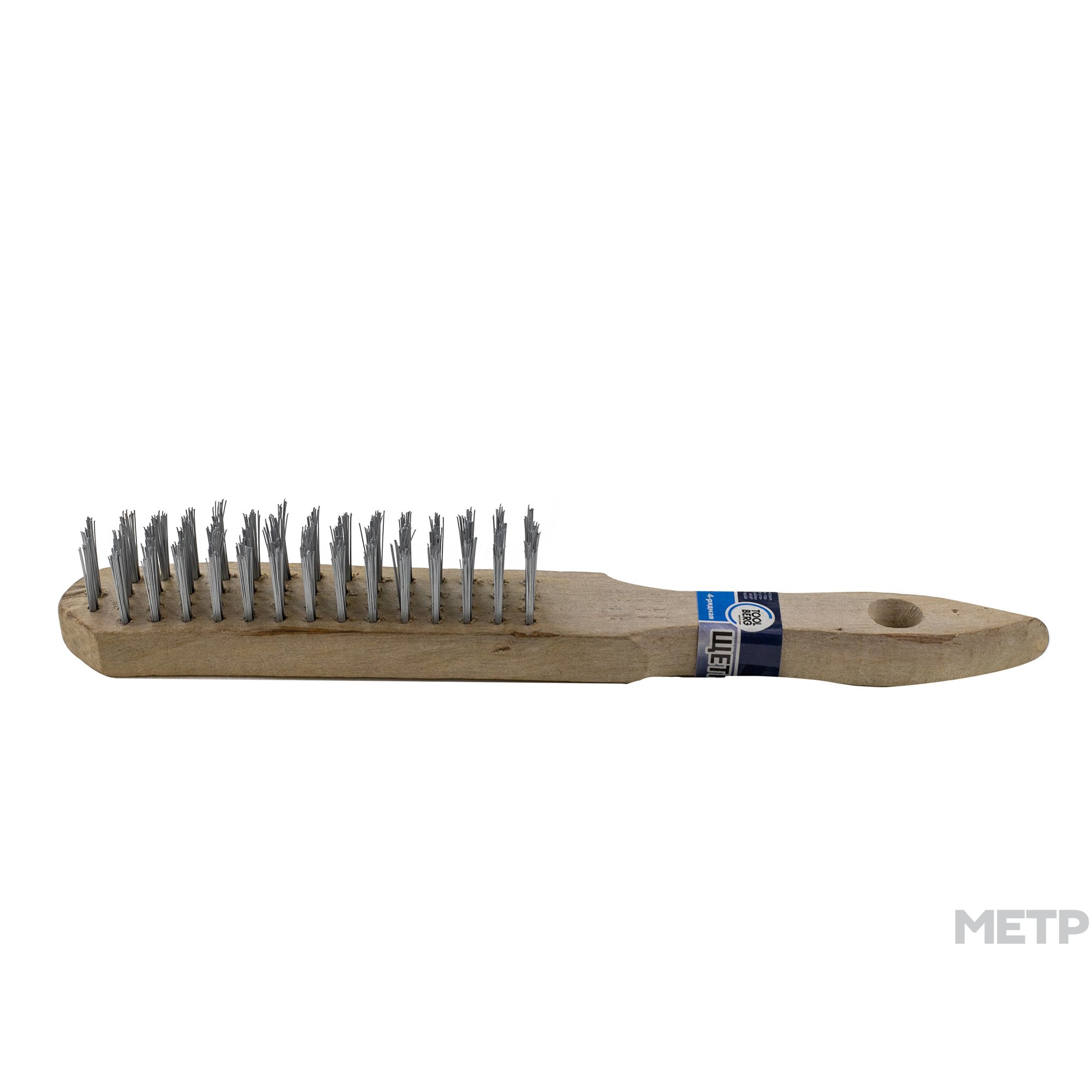 Щетка металлическая 120 мм T4P 4-рядная, материал рукоятки – дерево. Применение такой щетки – верный способ очистить поверхности от особо стойких загрязнений различного типа. Инструмент удобен при использовании, не вызывает усталость во время продолжительных работ, прочен и надежен.