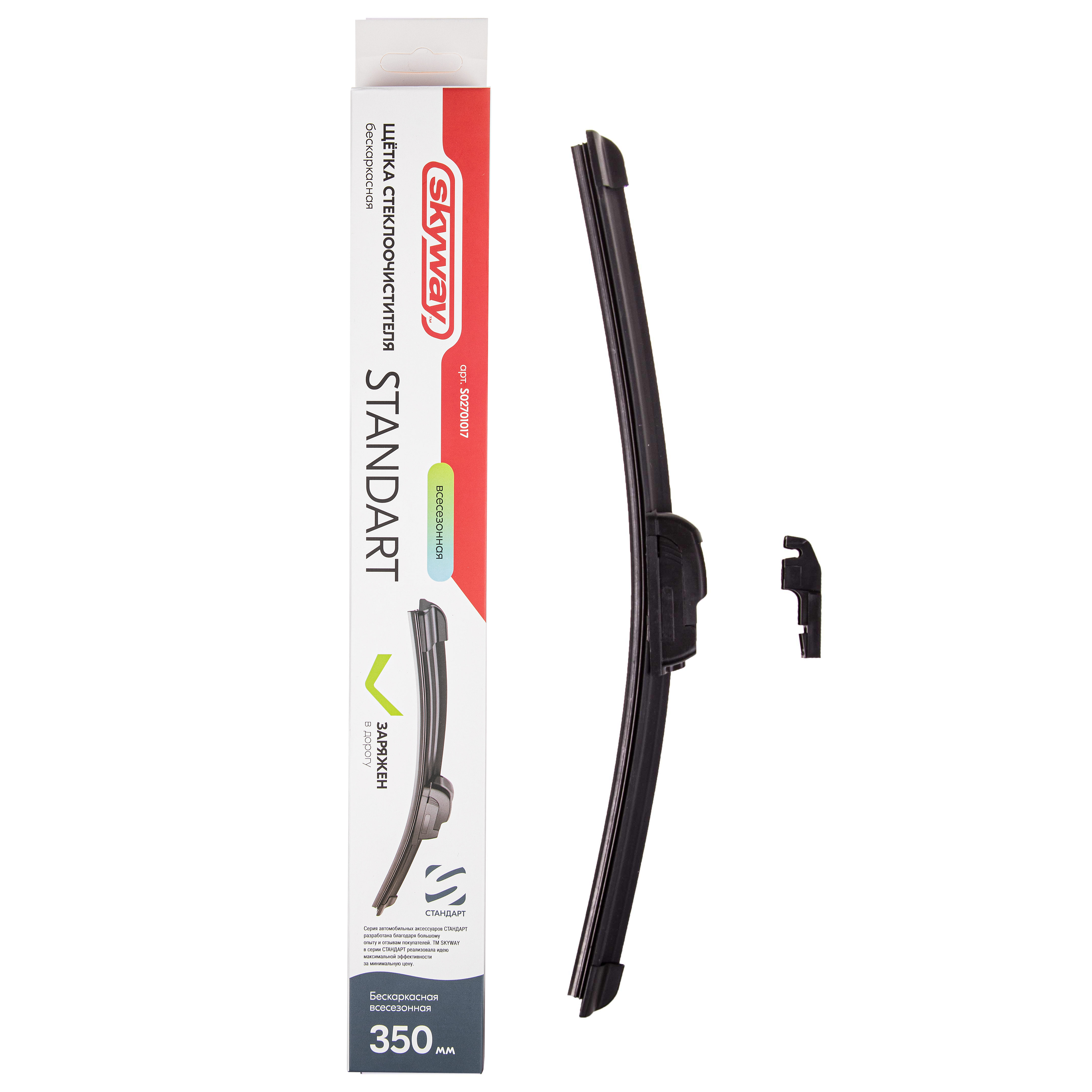 Щетка стеклоочистителя бескаркасная SKYWAY S02701017 350 мм - обеспечивает равномерное очищение всей поверхности стекла. Благодаря технологическому усовершенствованию щетки SKYWAY способны удалять даже самые мелкие частицы воды. Натуральный каучук, из которого произведены щетки, и графитовое напыление позволяют значительно снизить уровень шума, а также увеличивают срок службы. И это еще не все: щетка скользит по поверхности с минимальным усилием, а резина остается эластичной в жару, мороз и даже под действием химических реагентов. Щетка плотно прилегает к стеклу даже на большой скорости, надежно защищая его от загрязнений.