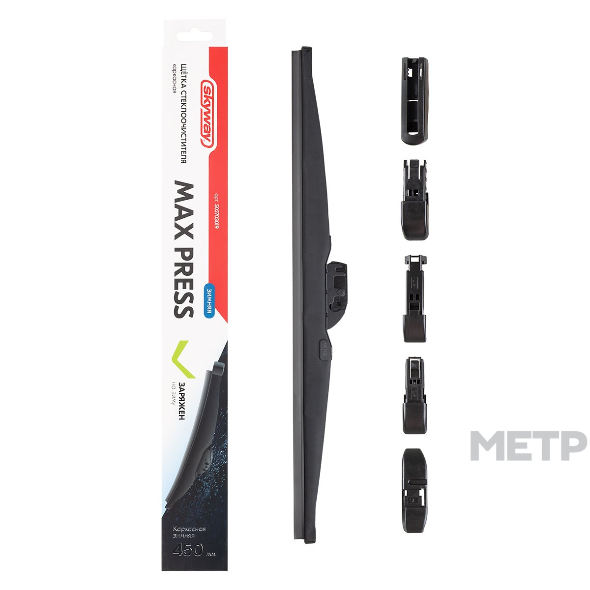 Щетка стеклоочистителя каркасная зимняя SKYWAY MAX PRESS 6 адаптеров в коробке - обеспечивает плавное и легкое скольжение щеток благодаря графитовому напылению. Все подвижные элементы защищены резиновым кожухом, идеальны для суровых условий.