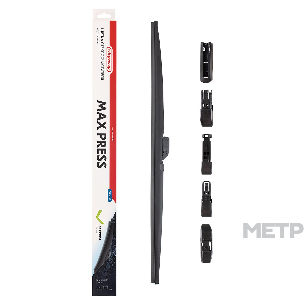 Щетка стеклоочистителя каркасная зимняя SKYWAY MAX PRESS 6 адаптеров в коробке - обеспечивает плавное и легкое скольжение щеток благодаря графитовому напылению. Все подвижные элементы защищены резиновым кожухом, идеальны для суровых условий.