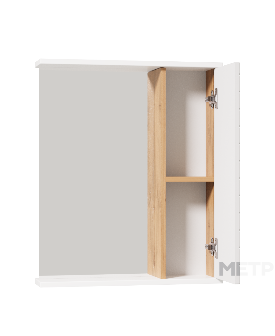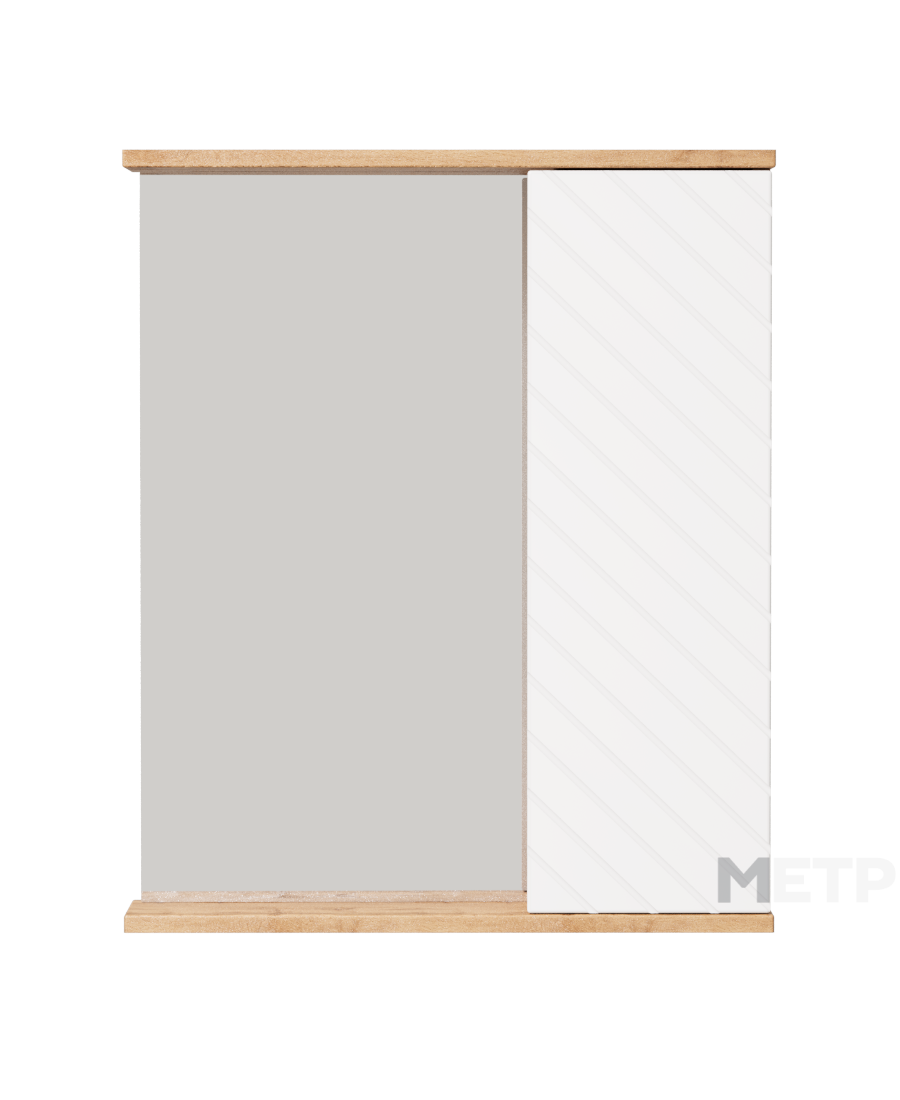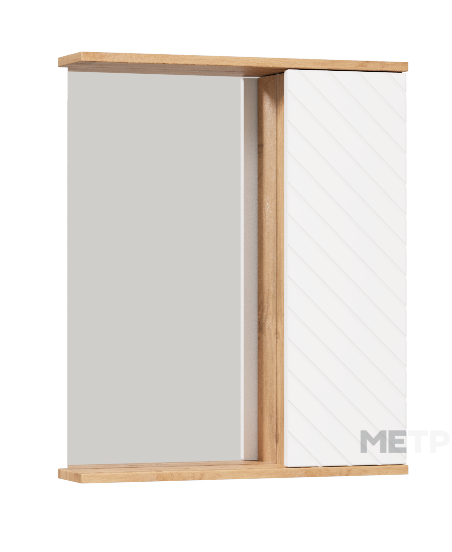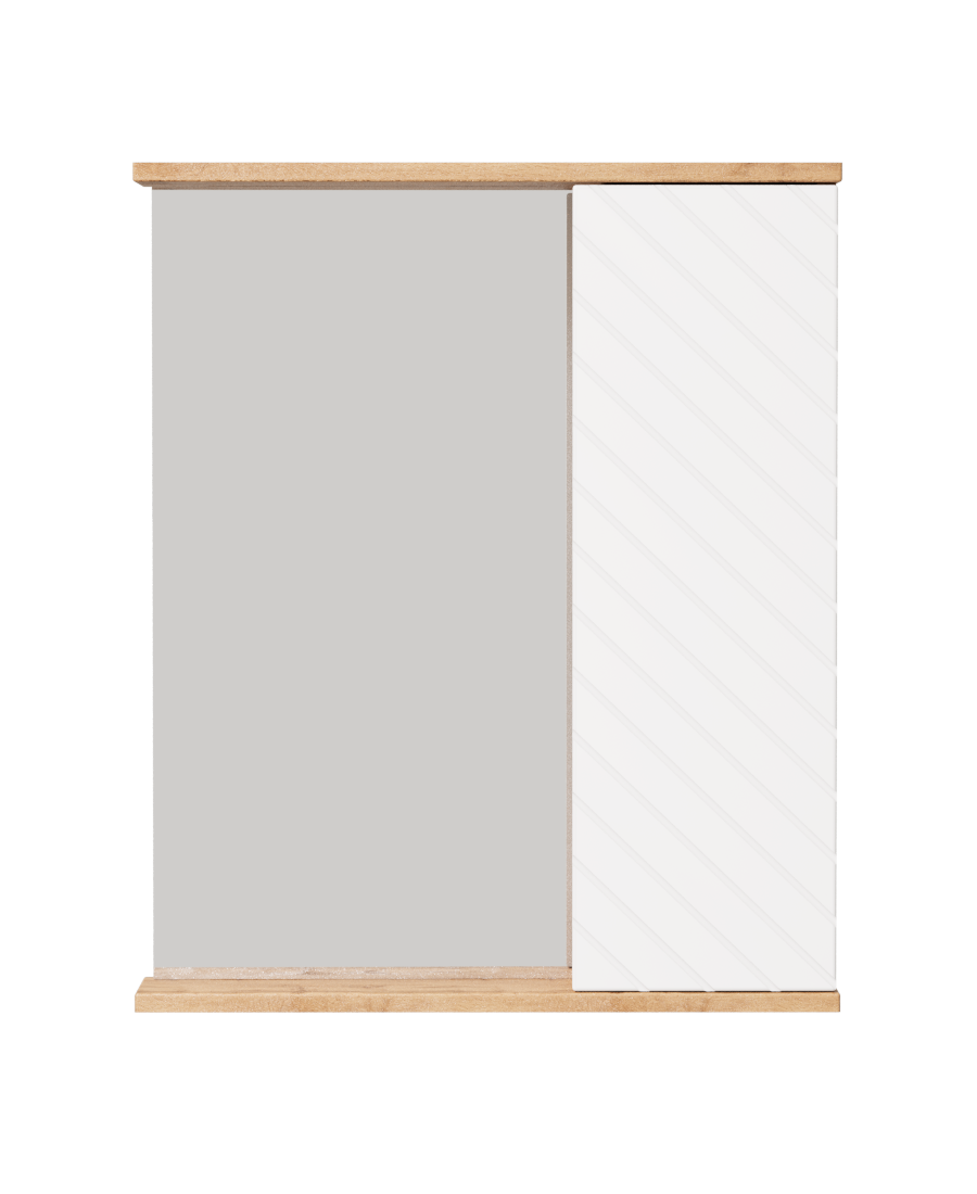 Зеркальный шкаф Ровенна шииной 60 см с правым отделением для хранения — стильное сочетание фасада в белом глянце с фрезеровкой и корпуса в цвете дуб вотан. Внутренние полки обеспечивают удобное размещение повседневных принадлежностей. Идеален для современных и скандинавских ванных комнат.