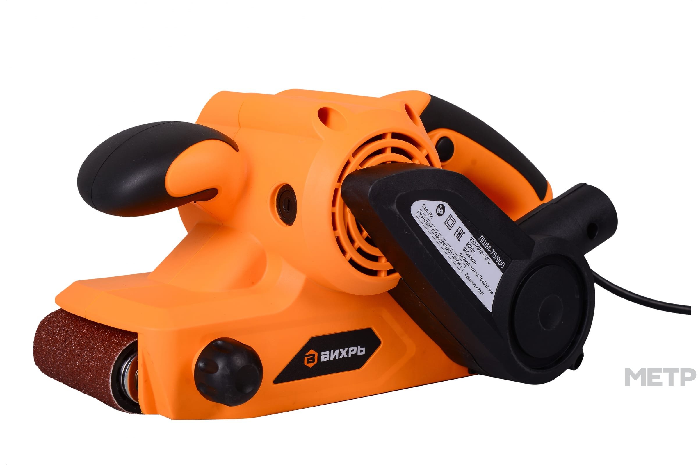 Шлифмашина ленточная Вихрь ЛШМ-75/900 относится к классу инструмента с электрическим двигателем. Она состоит из корпуса, в основании которого находятся два ролика. На них надевается замкнутая лента с абразивной поверхностью. Один из роликов ведущий, второй служит для регулировки поперечного положения ленты. За счёт вращения ленты на большой скорости и движения инструмента по заготовке происходит снятие верхнего слоя материала.