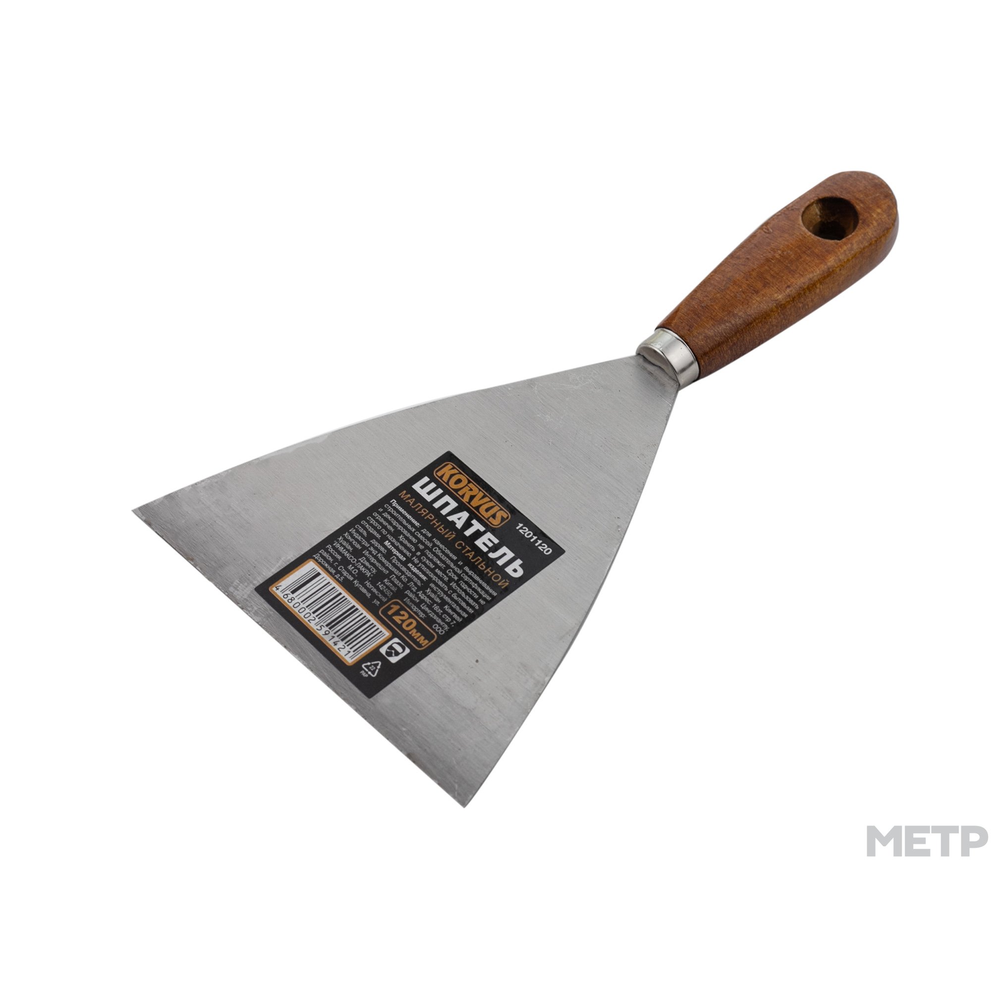 Шпатель универсальный, размером рабочего полотна из металла 120 мм, марки Korvus, выполнен из высокопрочной стали с нержавеющим покрытием. Металлическая часть прочно удерживается в деревянной рукоятке, приспособленной для длительного рабочего процесса. Широко используется в домашних и профессиональных строительных работах.
