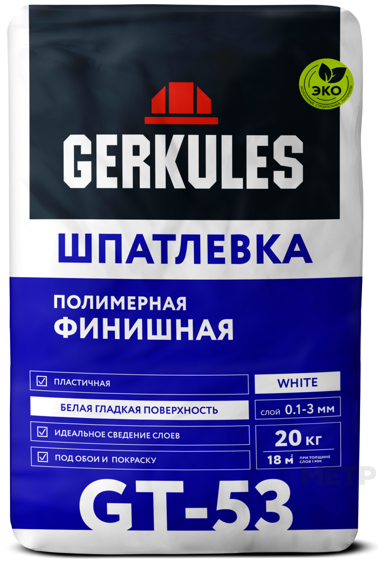Шпатлевка Финишная GT-53 Геркулес 20 кг предназначена для исправления незначительных дефектов и окончательного выравнивания различных оштукатуренных поверхностей, а также поверхностей из бетона, гипса, гипсокартона и гипсоволокнистых листов. Применяется внутри помещений с нормальной влажностью. Шпатлевка легко наносится, образует ровную поверхность, обладающую высоким сцеплением с основанием. Шпатлевка обладает возможностью использования приготовленного состава в течение длительного периода времени.Типы оснований: оштукатуренные поверхности, гипс, бетон, ГКЛ и ГВЛ.