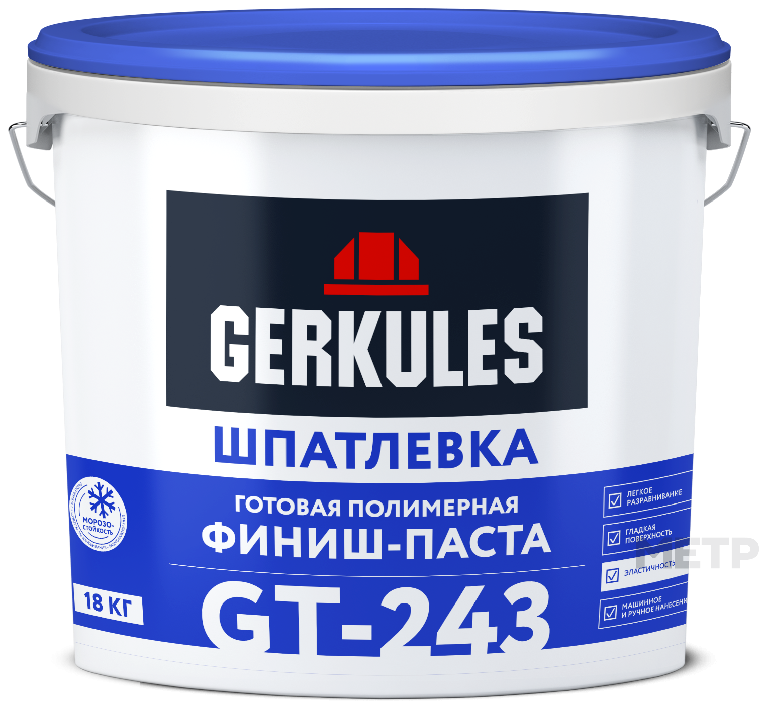 Шпатлевка Геркулес ФИНИШ-паста GT-243 белая 18 кг, готовая к применению финишная пастообразная полимерная шпатлёвка. Используется для финишного выравнивания поверхностей стен и потолков в сухих помещениях под дальнейшую отделку, а также приклеивания стеклохолста. Поверхность основания после высыхания белая, что способствует снижению расхода красок при окрашивании поверхностей.