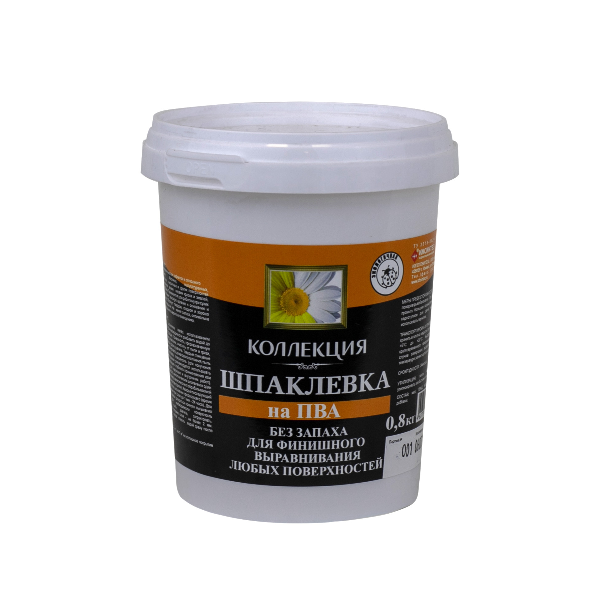Шпатлевка Коллекция на ПВА белая 0,8 кг, применяется для выравнивания мелких дефектов и сплошного шпаклевания бетонных, оштукатуренных, кирпичных и других поверхностей перед окраской любыми видами красок и эмалей, оклейкой обоями. Имеет высокую адгезию к основанию и малую усадку. Образует очень твердое и крепкое, гладкое и хорошо шлифуемое покрытие. Шпаклевка применяется для выравнивания бетона, штукатурки, гипсокартона, стекломагниевых поверхностей, кирпича, ДВП/ДСП, дерева, невпитывающих глянцевых поверхностей, волокнисто-цементных плит, гипса.