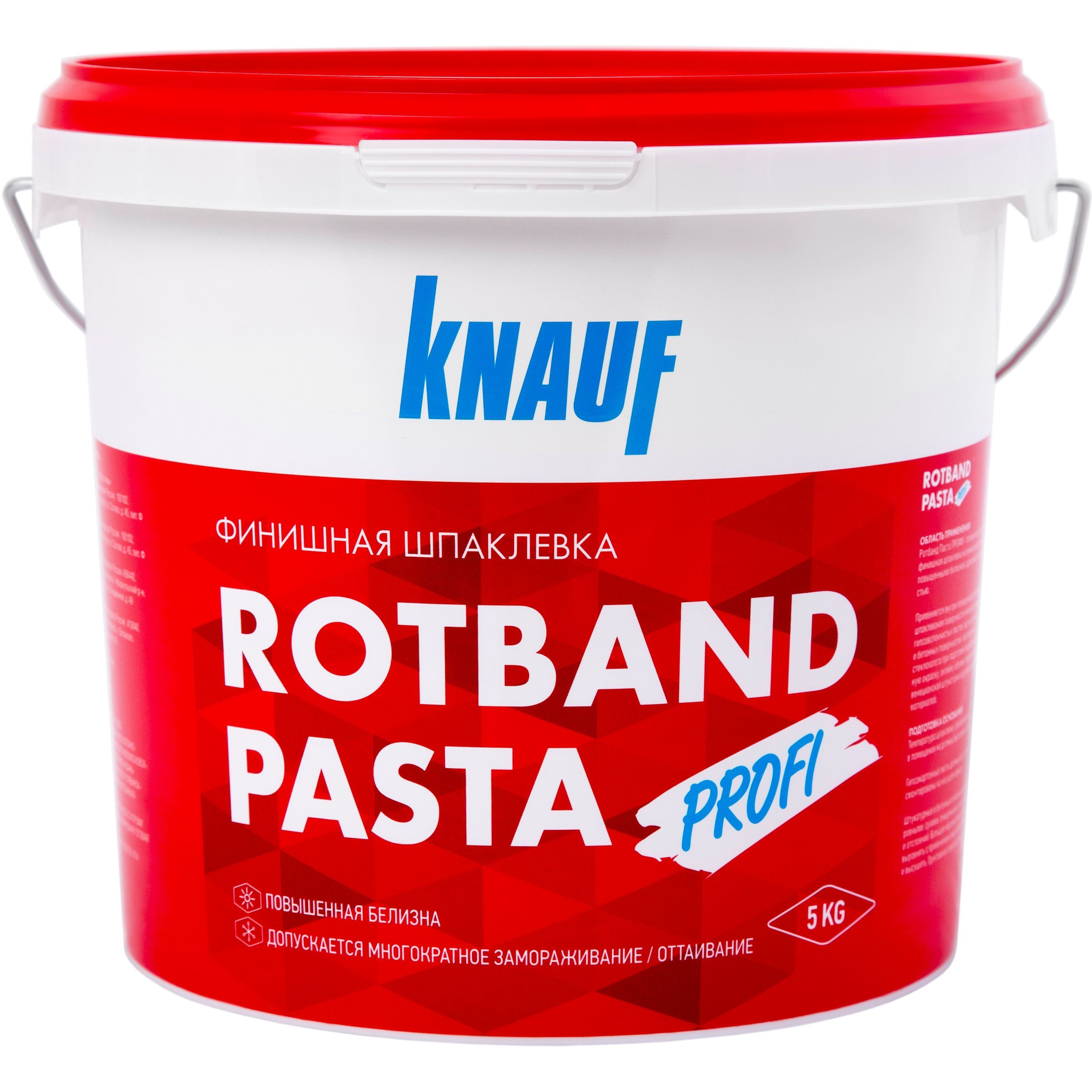 Шпатлевка Knauf Ротбанд Паста Profi 5 кг применяется внутри сухих помещений для финишного шпаклевания поверхности гипсокартонных или гипсоволокнистых листов, оштукатуренных и бетонных поверхностей, пазогребеневых плит, стеклохолста при подготовке под высококачественную окраску, оклейку обоями, перед нанесением венецианской штукатурки и других финишных материалов. Обладает повышенной белизной, адгезией и трещиностойкостью. Идеально подходит для тонкослойного шпаклевания поверхности. За счет высокой пластичности легко разравнивается и отлично заполняет мелкие неровности. После высыхания поверхность готова под финишное покрытие краской или обоями. Типы оснований: ГКЛ, ГКЛВ, ГВЛ, ГВЛВ, пазогребневые плиты; стеклохолсты; оштукатуренные бетонные поверхности.