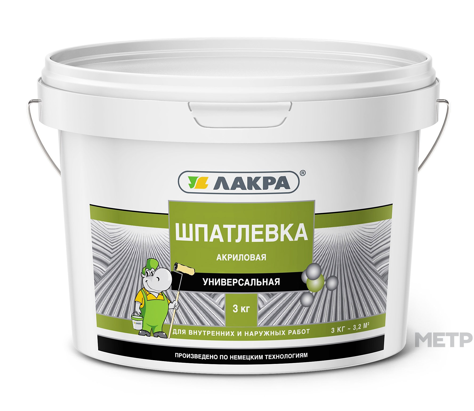 Шпатлевка акриловая Лакра для внутренних и наружных работ 3 кг - высококачественная, готовая к применению, шпатлевка на основе водной дисперсии акрилового сополимера, имеет высокую адгезию к основанию, стойкость к растрескиванию и малую усадку. После высыхания отлично шлифуется. Применяется для выравнивания стен и потолков внутри и снаружи помещений. Допускается использование на фасадах, при условии грунтования и последующей окраски фасадными материалами. Используется по кирпичу, бетону, штукатурке и другим минеральным поверхностям.
