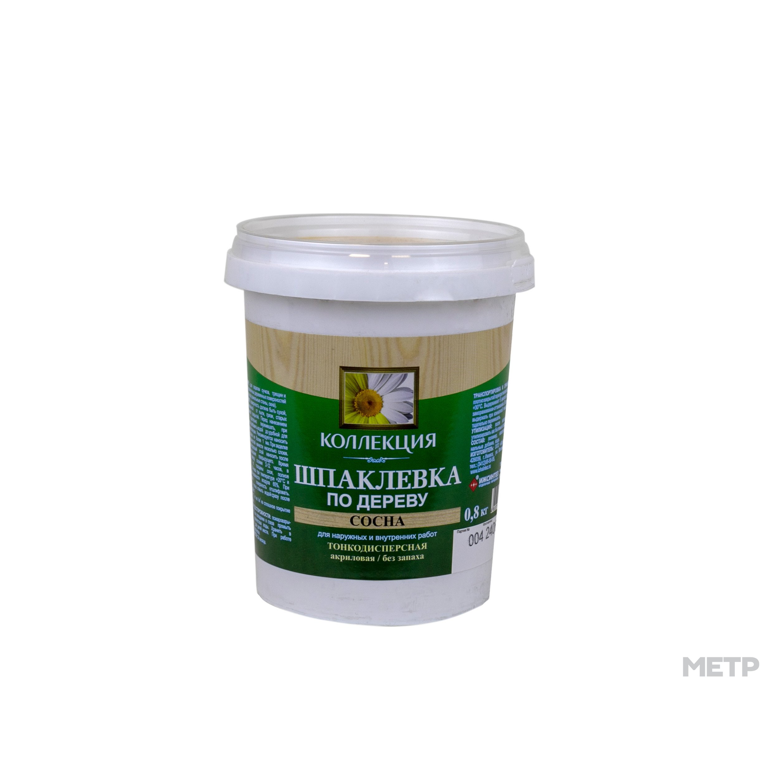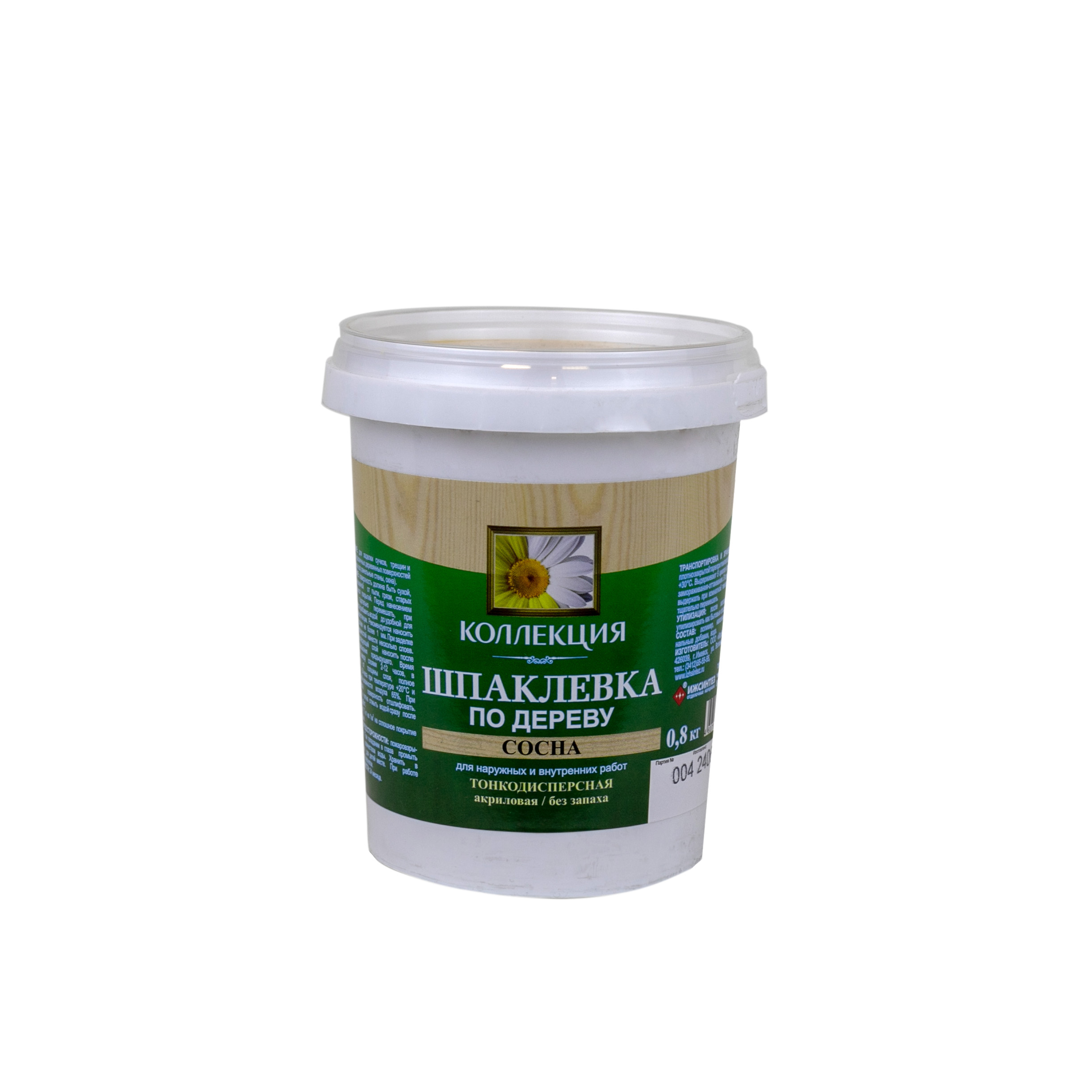 Шпатлевка по дереву Коллекция сосна 0,8 кг - профессиональная шпатлевка для заделки сучков, трещин, неровностей различных деревянных поверхностей (мебель, двери, пол, панельные стены, окна). Шпатлевка не имеет резкого запаха, применима для наружных и внутренних работ, колеруется в любой цвет, используется против грибка и плесени. Поверхность должна быть сухой, прочной, очищенной от пыли, грязи, старых отслаивающихся покрытий. Перед нанесением шпаклевку тщательно перемешать, при необходимости разбавить водой до удобной для работы консистенции. Рекомендуется наносить шпаклевку слоем не более 1 мм. При заделке глубоких неровностей нанести несколько слоев. Каждый последующий слой наносить после полного высыхания. При необходимости поверхность отшлифовать.