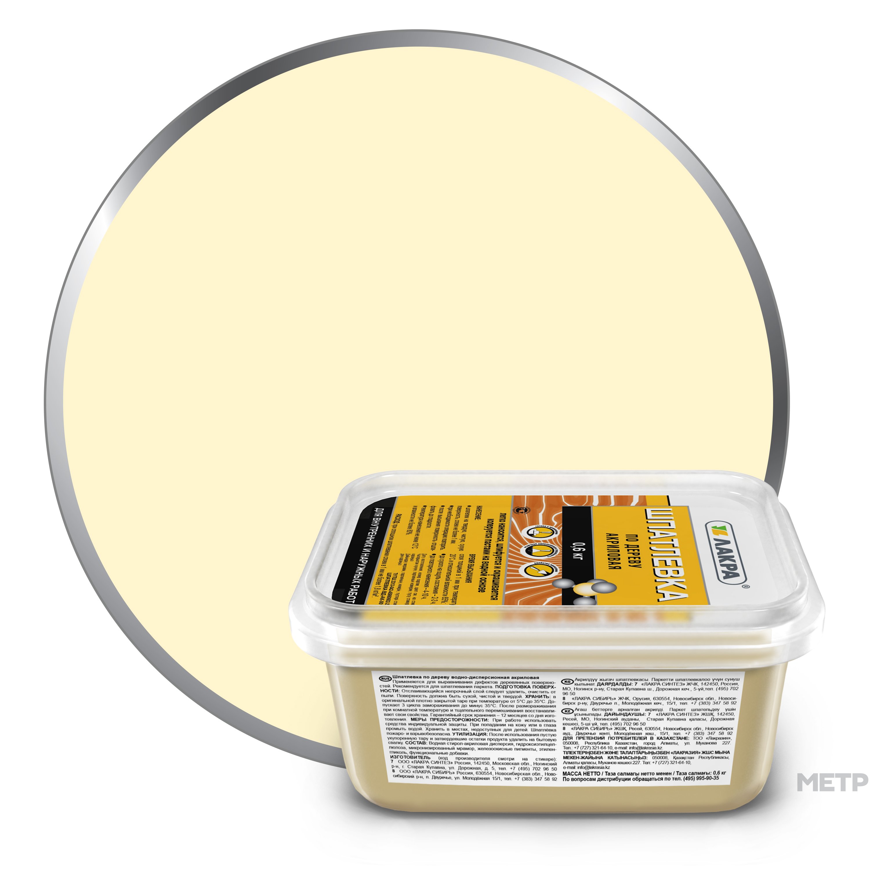 Шпатлевка по дереву Лакра берёза, 0,6 кг - высококачественная шпатлевка на основе водной акриловой дисперсии. Имитирует цвет необработанного дерева. Благодаря мелкозернистой структуре легко наносится и прекрасно шлифуется. Обладает отличной заполняющей способностью. Обработанная шпатлевкой поверхность является идеальной основой для дальнейшей окраски при выполнении работ с высоким уровнем качества. Для достижения необходимого оттенка шпатлевки возможно использование колеровочных паст на водной основе. Применяется для заполнения и выравнивания трещин, дефектов (сколы и т.п.), повреждений и неровностей на деревянных поверхностях (мебель, двери, пол, панельные стены, потолок). Рекомендуется для шпатлевания паркета.