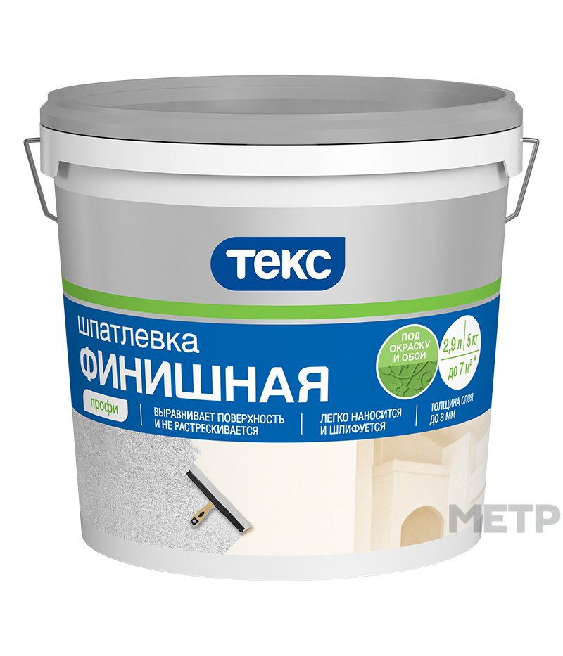 Шпатлевка ТЕКС Профи финишная выравнивающая белая 5 кг, предназначена для выравнивания и финишной отделки стен и потолков внутри сухих помещений по гипсокартонным плитам, оштукатуренным и бетонным поверхностям под окраску или оклеивание обоями. Подходит для заделки швов между гипсокартонными плитами с использованием самоклеящейся ленты или серпянки. Образует гладкую прочную поверхность, выравнивает поверхность и не растрескивается, легко наносится и шлифуется. Толщина слоя до 3 мм.