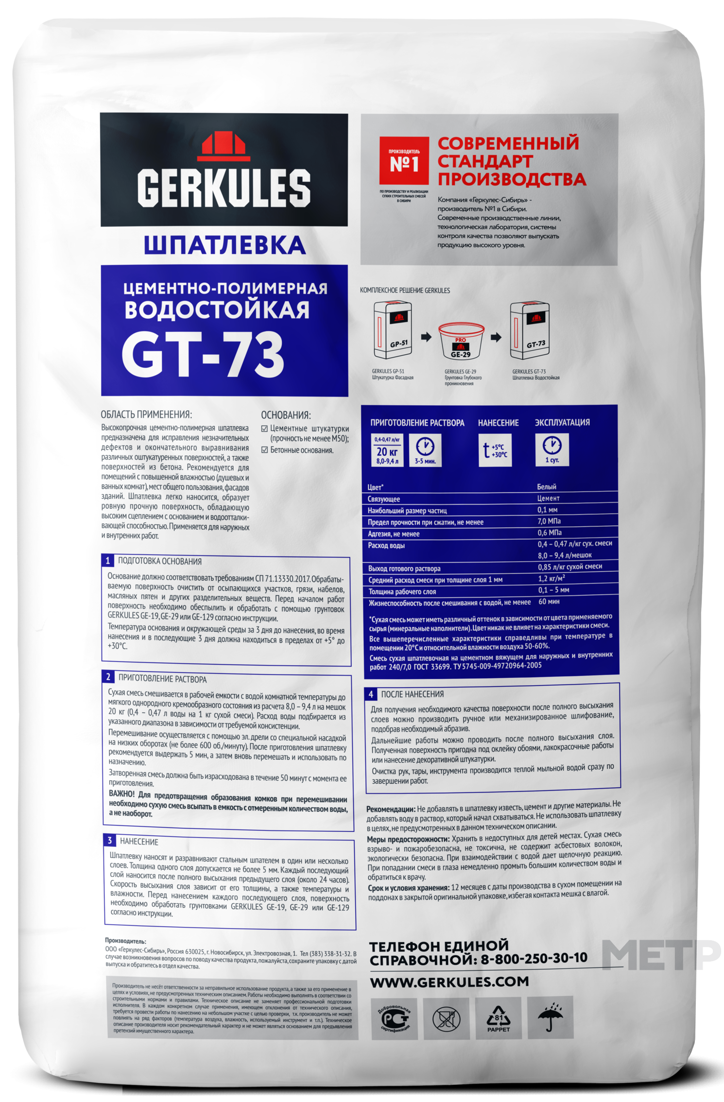Шпатлевка Цементно-полимерная водостойкая GТ-73 Геркулес 20 кг предназначена для исправления дефектов и выравнивания различных оштукатуренных поверхностей, а также поверхностей из бетона и ячеистого бетона. Применяется для наружных и внутренних работ. Рекомендуется для помещений с повышенной влажностью (душевых и ванных комнат). Шпатлевка легко наносится, образует ровную прочную и водостойкую поверхность, обладающую высоким сцеплением с основанием.Типы оснований: бетон, ячеистый бетон; оштукатуренные поверхности.