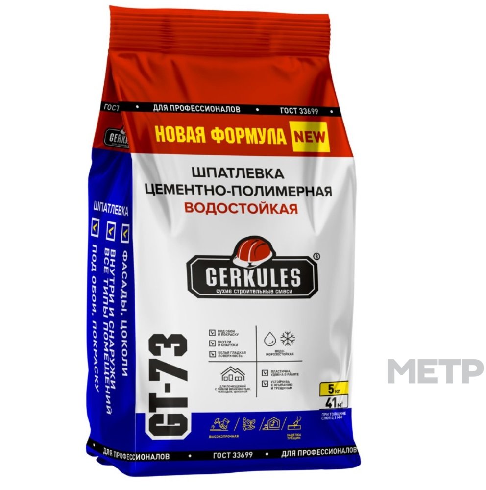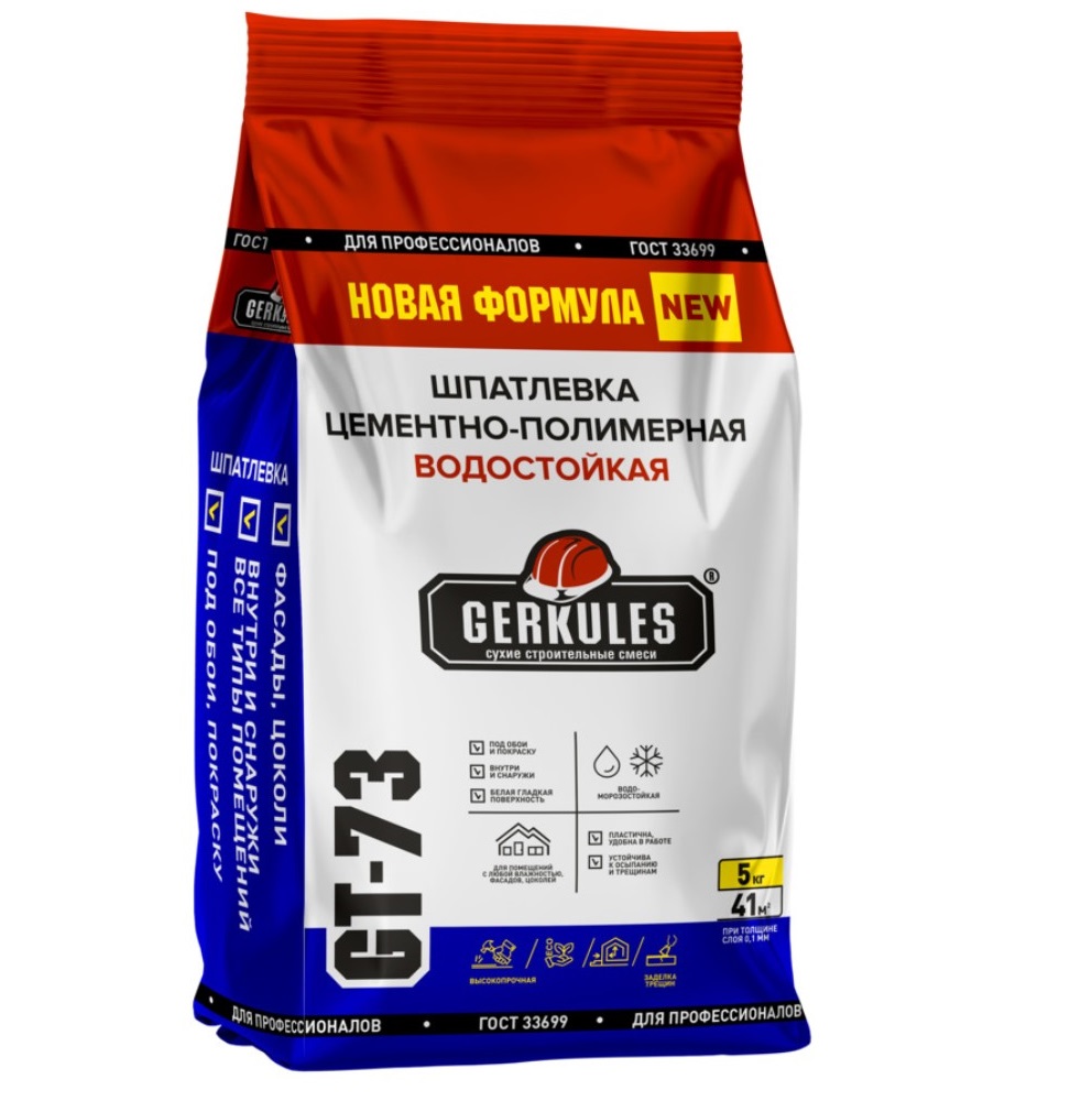 Шпатлевка Цементно-полимерная водостойкая GТ-73 Геркулес 5 кг предназначена для исправления дефектов и выравнивания различных оштукатуренных поверхностей, а также поверхностей из бетона и ячеистого бетона. Применяется для наружных и внутренних работ. Рекомендуется для помещений с повышенной влажностью (душевых и ванных комнат). Шпатлевка легко наносится, образует ровную прочную и водостойкую поверхность, обладающую высоким сцеплением с основанием. Типы оснований: бетон, ячеистый бетон; оштукатуренные поверхности.