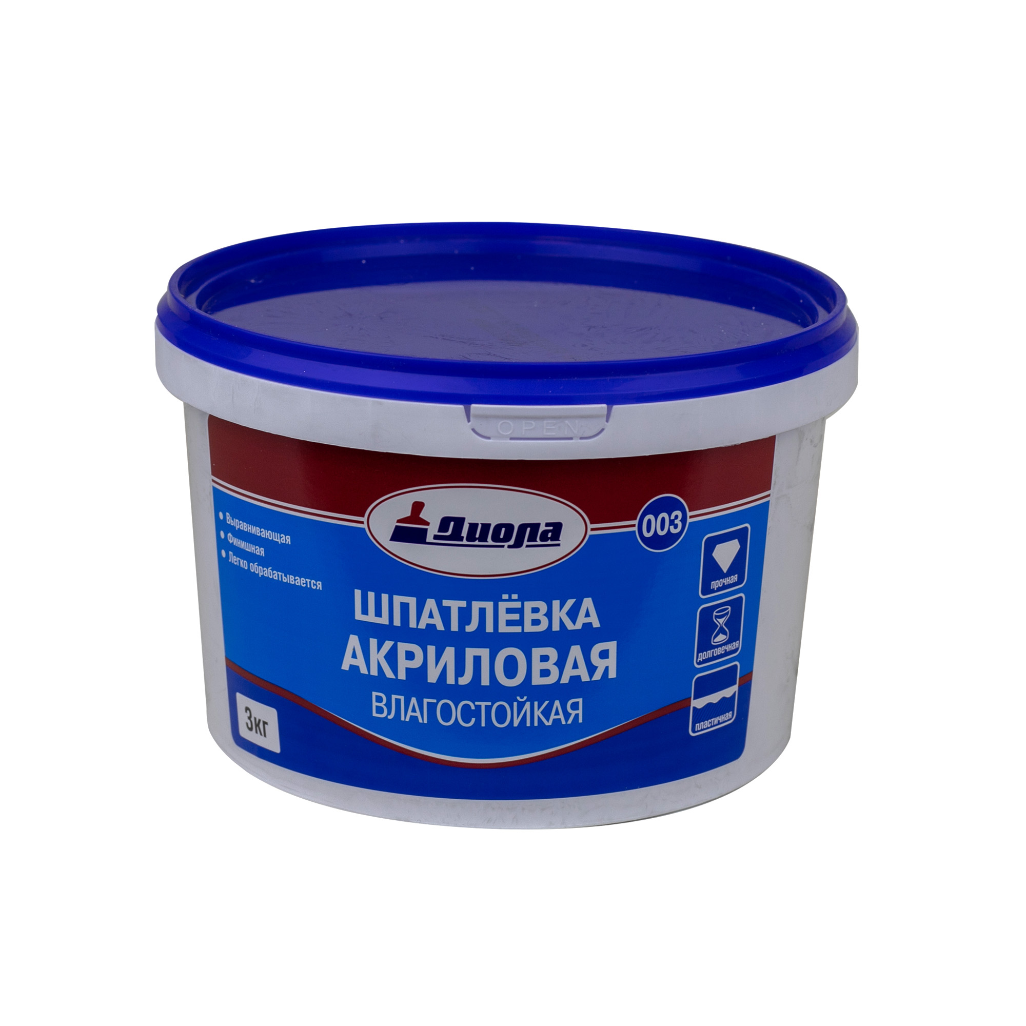 Шпатлевка акриловая Диола-003 интерьерная белая 3 кг, применяется для выравнивания бетонных, гипсовых, пенобетонных, оштукатуренных поверхностей, ГКЛ. Для проведения подготовительных работ под покраску и под обои. Предназначена для внутренних работ в помещениях с нормальной и повышенной влажностью. Применяется также для создания прочного финишного слоя при отделке проемов стен и оконных ниш, обработки арок и колонн. Хорошо выравнивает и легко обрабатывается.