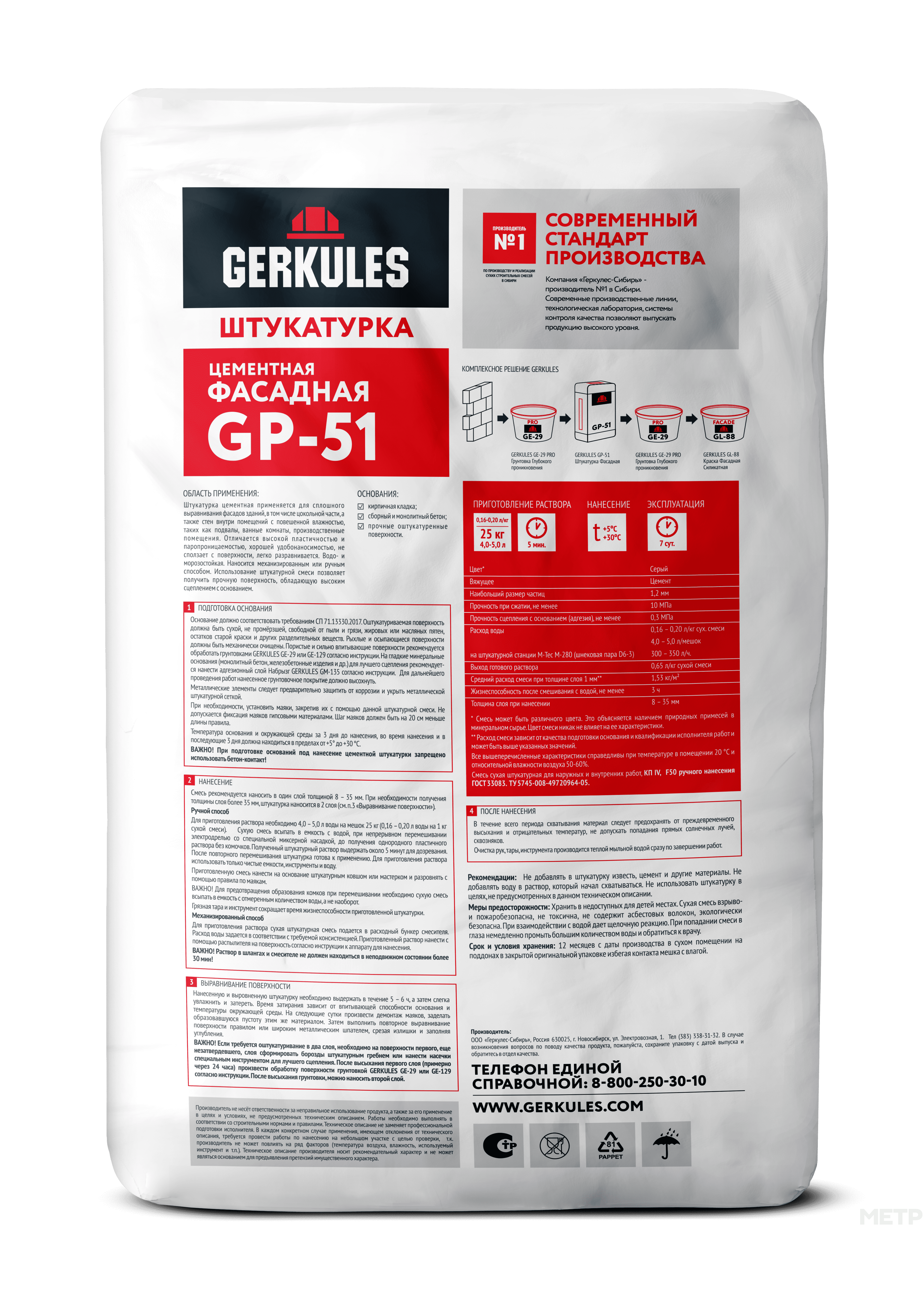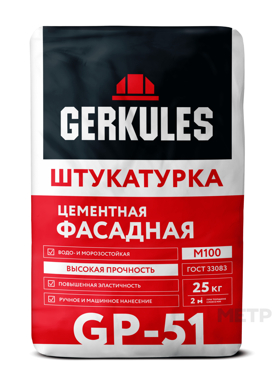 Штукатурка GP-51 Геркулес 25кг предназначена для оштукатуривания фасадов зданий (в т. ч. цокольной части), стен внутри помещений с повышенной влажностью (подвалы, прачечные, производственные помещения и т.п.). Наносится вручную или механизированным способом (с помощью растворосмесительных насосов непрерывного действия. Штукатурка легко наносится и не сползает с поверхности, обладает необходимой прочностью и сцеплением с основанием. Штукатурка имеет повышенную прочность и эластичность. Типы оснований: бетон, кирпич, минеральные основания.