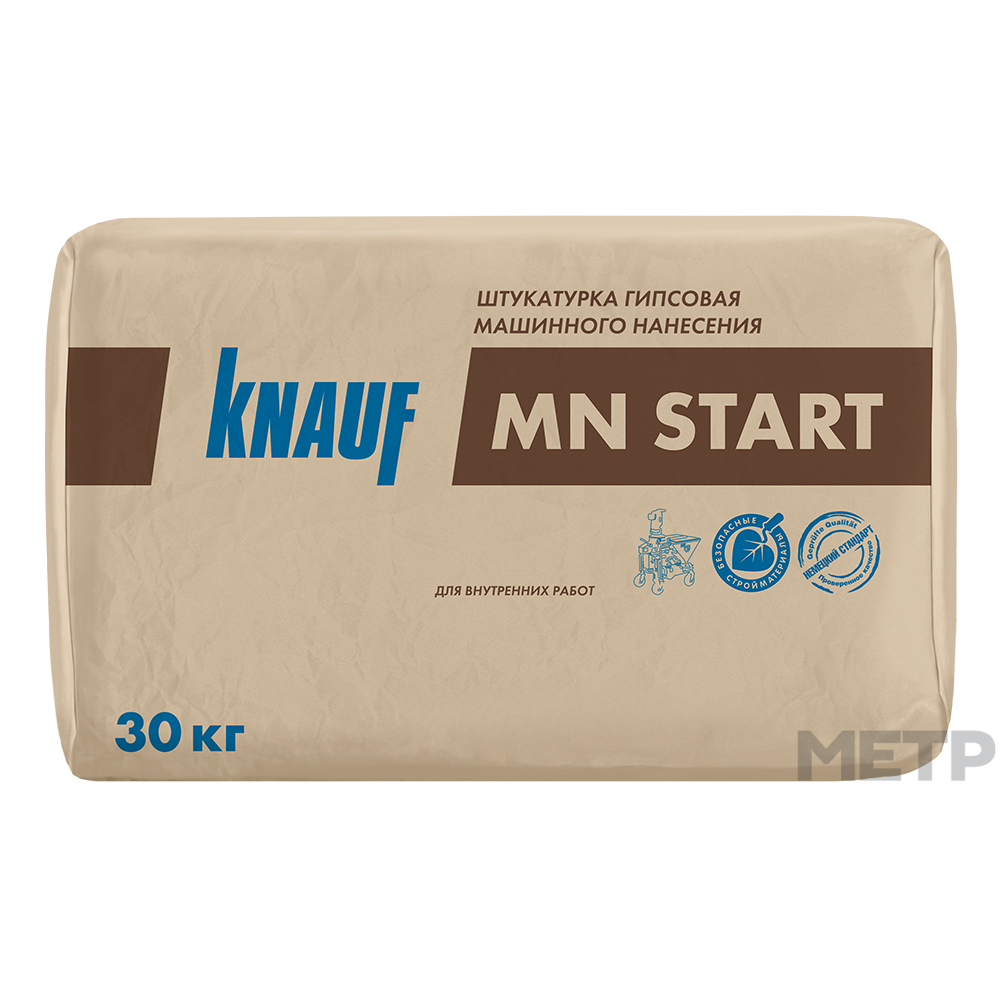 Штукатурка МН СТАРТ Knauf 30 кг предназначена для оштукатуривания стен внутри помещений машинным способом с помощью штукатурных машин. Наносится на обычные твердые основания: кладку из кирпича (керамического, силикатного, пустотелого и т.д.), бетон, гипсовые и бетонные блоки, старые цементные и гипсовые штукатурки, газобетон и пенобетон, а также на сложные основания: ЦСП, ПГП, ГКЛ (ГСП), щепоцементные плиты и блоки. КНАУФ-МН СТАРТ можно использовать для отделки помещений с нормальной влажностью, а также в кухнях и ванных комнатах с покрытием, обеспечивающим защиту от увлажнения. Подходит для внутренних работ.