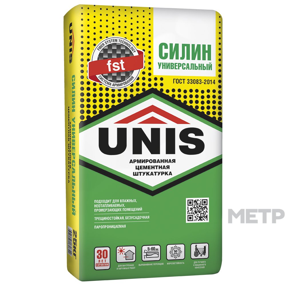 Штукатурка Силин универсальная армированная Юнис 25кг, предназначена для выравнивания поверхностей стен слоем до 30 мм (без штукатурной сетки); для ремонта сколов, выбоин, раковин, трещин глубиной до 60 мм, заполнения стыков ЖБИ. Рекомендуется использовать для наружных работ, а также внутри сухих и влажных, отапливаемых и неотапливаемых помещений. Допускается использовать для возведения стен и перегородок из газосиликата, пенобетона, газобетона, силикатного и керамического кирпича. Используется для ручного и механизированного нанесения.