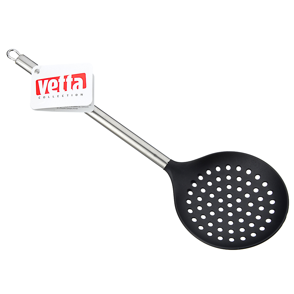 Шумовка VETTA Аргенто 33 см из пластика помогает в приготовлении блюд, которые при подаче отделяются от жидкости. Отличается привлекательным дизайном, который поможет украсить современную кухню. Не влияет на качество и вкус еды. Не впитывает запахи и легко очищается от загрязнений.