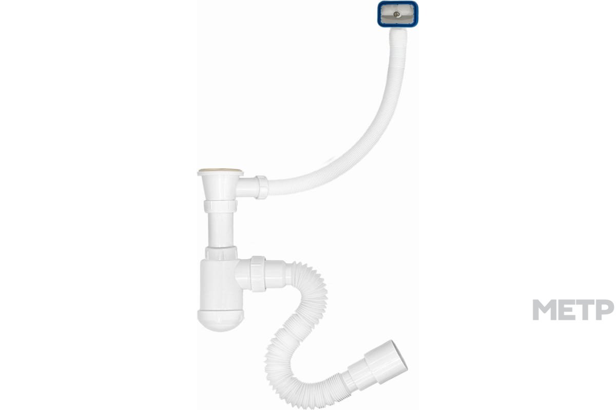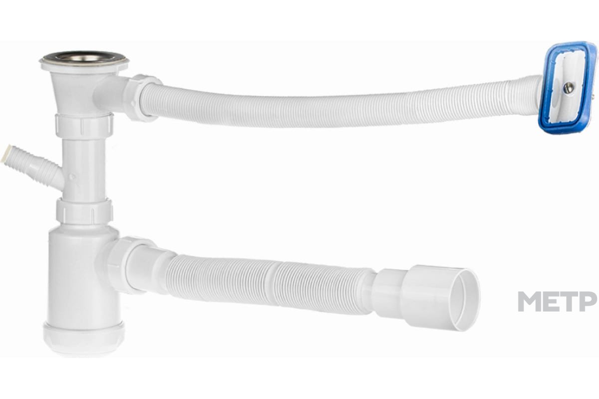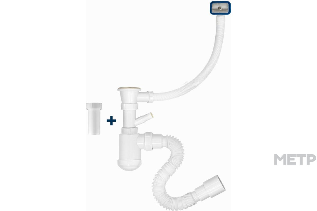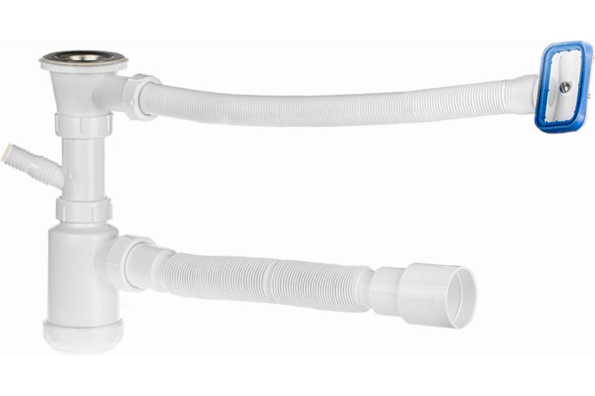 В комплектацию сифона входит 2 патрубка : патрубок с отводом для подключения сливного шланга (диаметра 19-22мм) бытовой техники и патрубок без отвода,что делает сифон универсальным, позволяя выбрать нужную для подключения комплектацию.