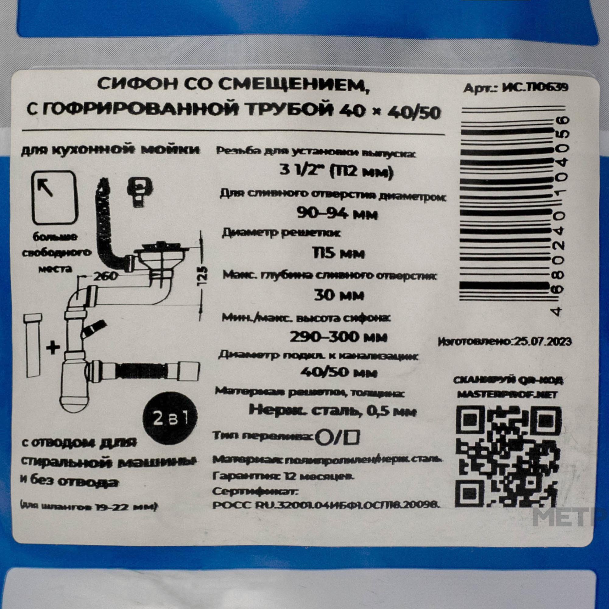 Смещенный сифон предназначен для более эффективного использования пространства под кухонной мойкой. Если мойка установлена в тумбе или кухонном шкафу, то можно использовать все полезное пространство - сифон не будет мешать.На данном сифоне реализован разборный выпуск . Выпуск сифона оснащён решёткой из нержавеющей стали диметра 115 мм и толщиной 0,5мм. Подходит для раковин с диаметром сливного отверстия 90-94мм.Резьба для его установки 1 1/2". При необходимости возможно подключить переливной патрубок (резьба для его установки 1"). В стандартной комплектации отверстие для установки перелива заглушено.