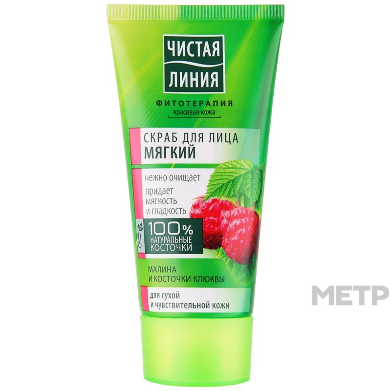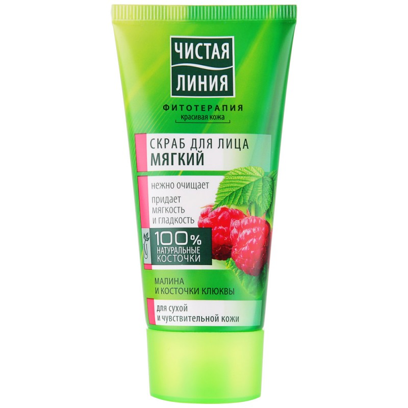 Скраб для лица Чистая Линия мягкий 50 мл для чувствительной кожи тонизирует и обеспечивает увлажнение. Помогает очистить ее от загрязнений и придает мягкость. Способствует восстановлению и защищает от сухости. Отшелушивает мертвый слой, ускоряя процесс обновления эпидермиса.